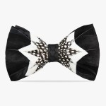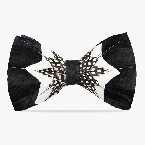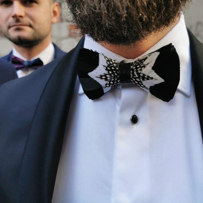 Szczegóły produktu | Muszka Gatsby wykonana jest z piór perliczki oraz gęsi. Unikatowy sposób wykonania pozwala zmienić dwa rodzaje piór we wzór gwiazdy. Środek muszki podkreśla opaska ze wzorem łuski.
