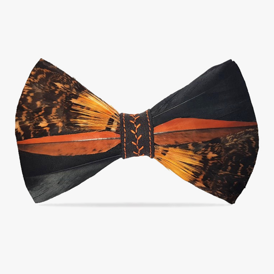 Szczegóły produktu | Szlachetne barwy muszki zawdzięczami doborowi piór bażanta, gęsi i tragopana. Muszka łączona jest haftowanym, delikatnym przeszyciem podkreślającym jej kolor.