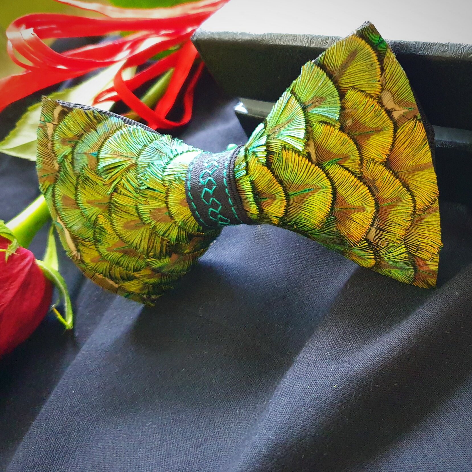 Szczegóły | Muszka męska Kaddo wykonywane są z naturalnych pawich piór o zielonym odcieniu i wyjątkowym połysku. Kochamy zwierzęta, dlatego swoje półprodukty pozyskujemy jedynie podczas naturalnego gubienia piór przez ptaki. Ponieważ pawie tracą swoje pióra stosunkowo rzadko, mucha męska Kaddo zaliczana jest do edycji limitowanej. Podczas ręcznego tworzenia wyjątkowej muchy Zuzzo indywidualnie dobieramy każde pióro, aby razem z elegancką opaską tworzyły spójną i niepowtarzalną całość.