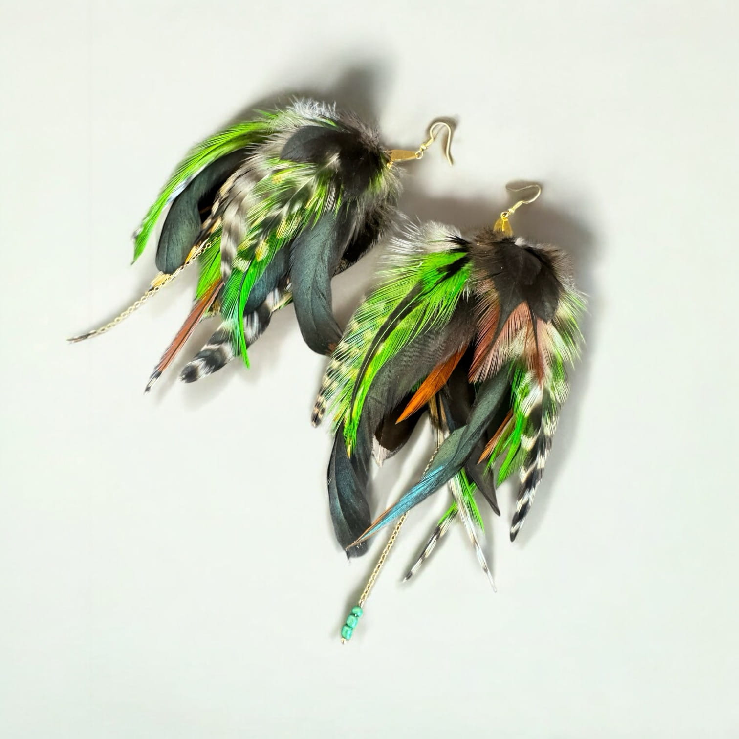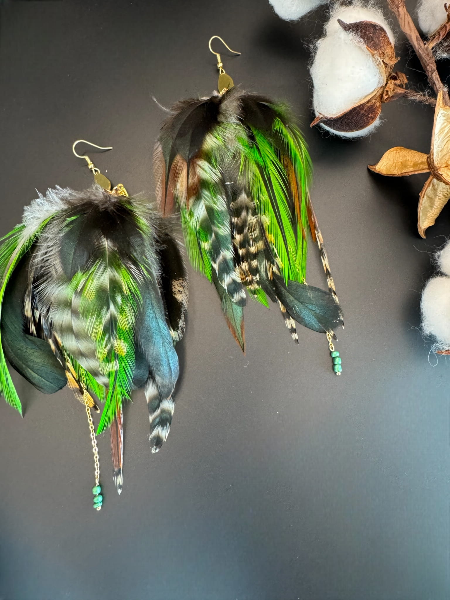 - kolczyki z piór Over green zostały przygotowane z piór, które udostępnił Ci paw królewski oraz kogut;