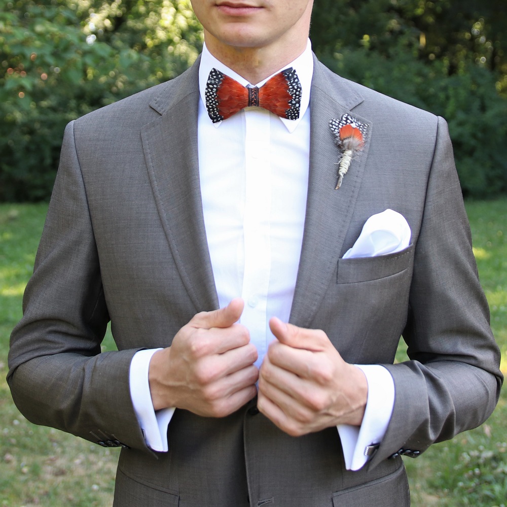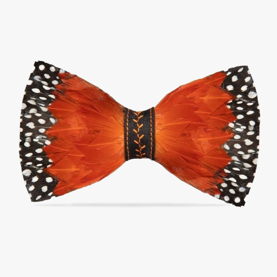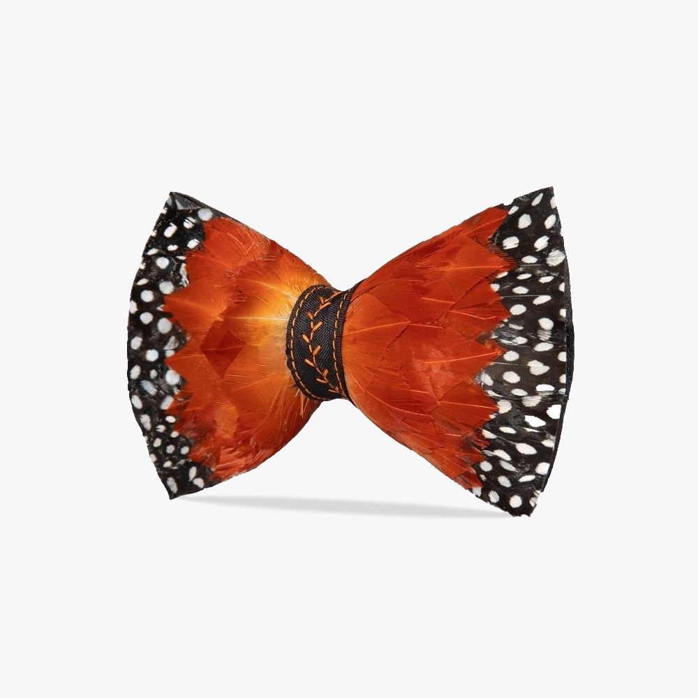 Szczegóły produktu | Muszka Monarcha wykonana jest z piór tragopana oraz perliczki. Wyjątkowy sposób wykonania pozwala połączyć dwa rodzaje piór tak, aby utworzyć wzór składający się z trzech kolorów: pomarańczowego, czarnego oraz białego. Łączenie jest wykonane w kolorze pomarańczowym z haftowanym zdobieniem.