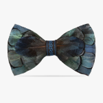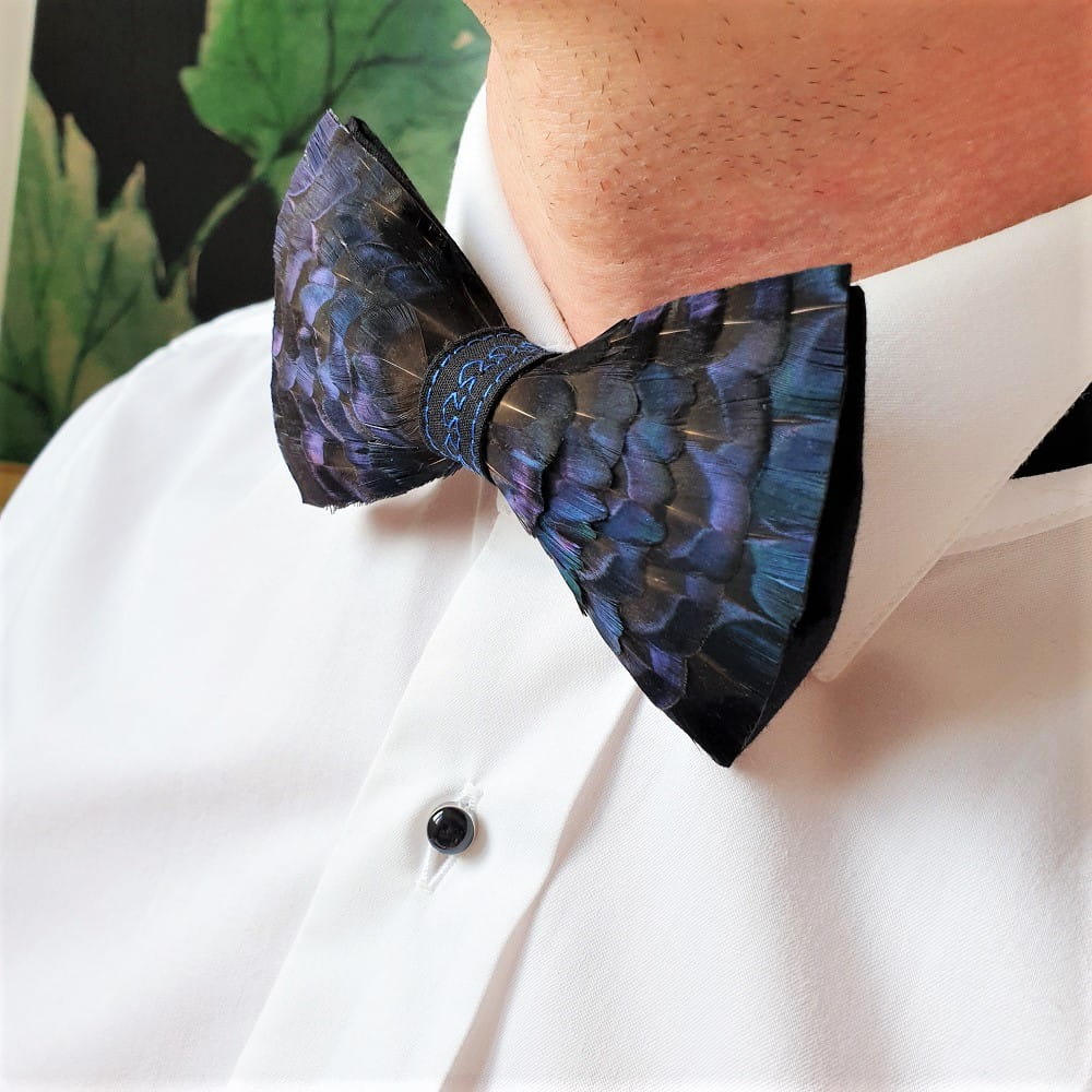 Szczegóły | Muszka Niebieski Skarabeusz wykonana jest z piór bażanta diamentowego, które mają niebieski, metaliczny poblask. Środkowa część muszki ma niebieskie przeszycie, podkreślające barwę piór.