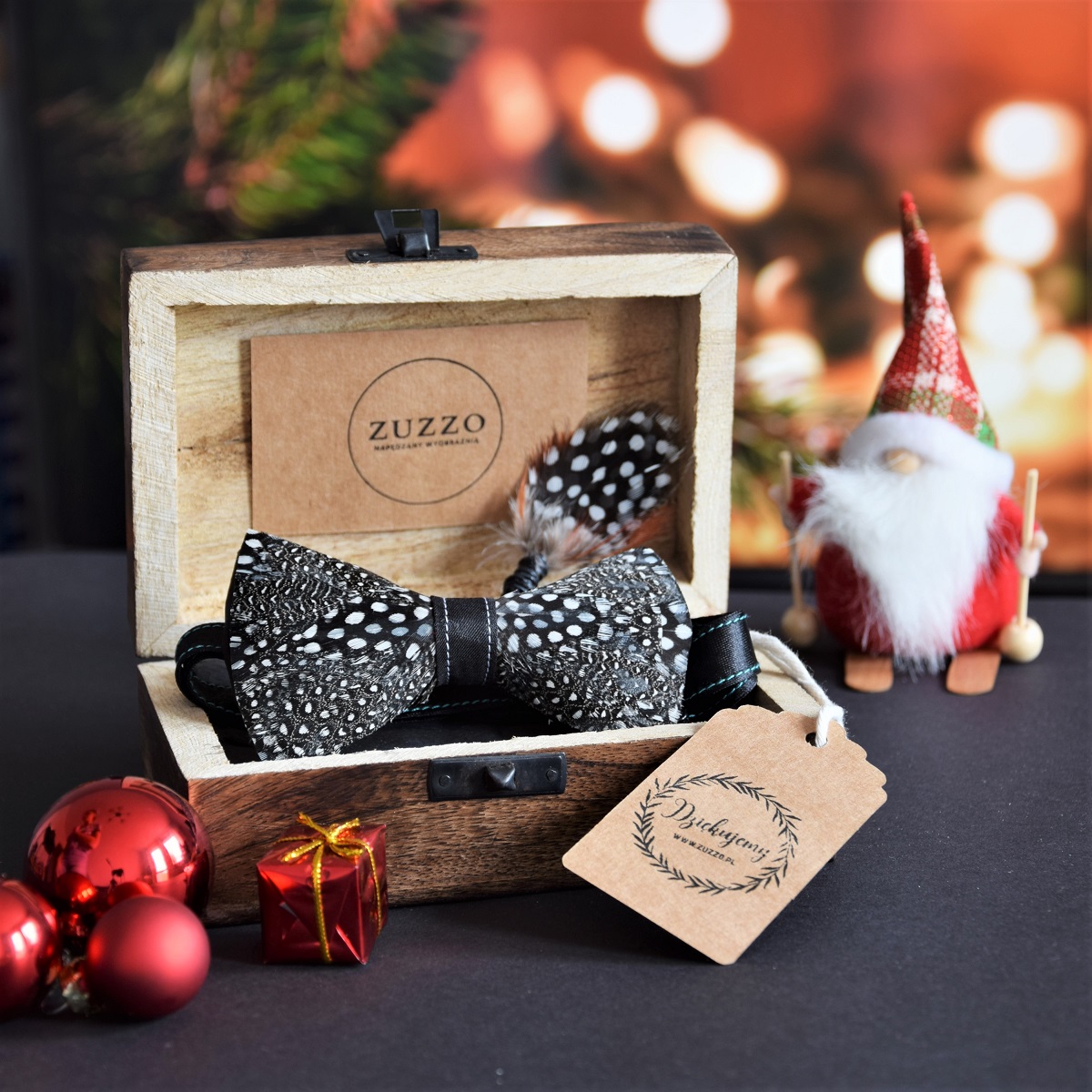 Dbanie o produkt | Muszka Perliczka jest dostarczana w zdobionym ECO pudełku. Zawiera ono listę użytych piór oraz instrukcje, jak o nią dbać.