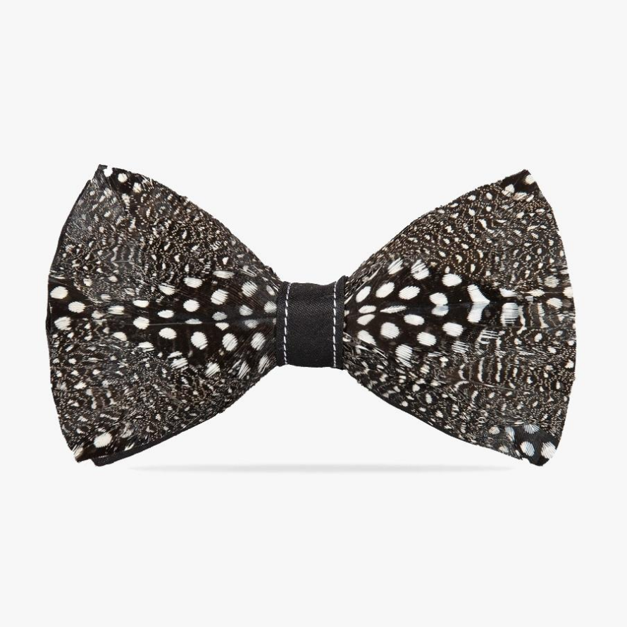 Szczegóły | Muchę zdobi wzór w kropki, w którym dominują biały, czarny i szary kolor. W centrum i na rogach muszki umieściliśmy pióra o większych, wyraźniejszych kropkach, tak by przyciągały one wzrok. Łączenie zdobi białe, delikatne przeszycie, które uzupełnia całość kompozycji nie odwracając uwagi od pięknych piór.