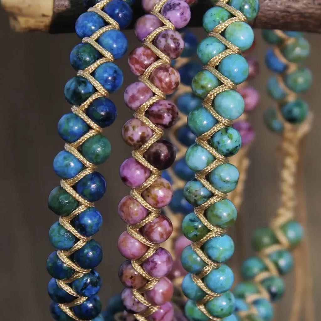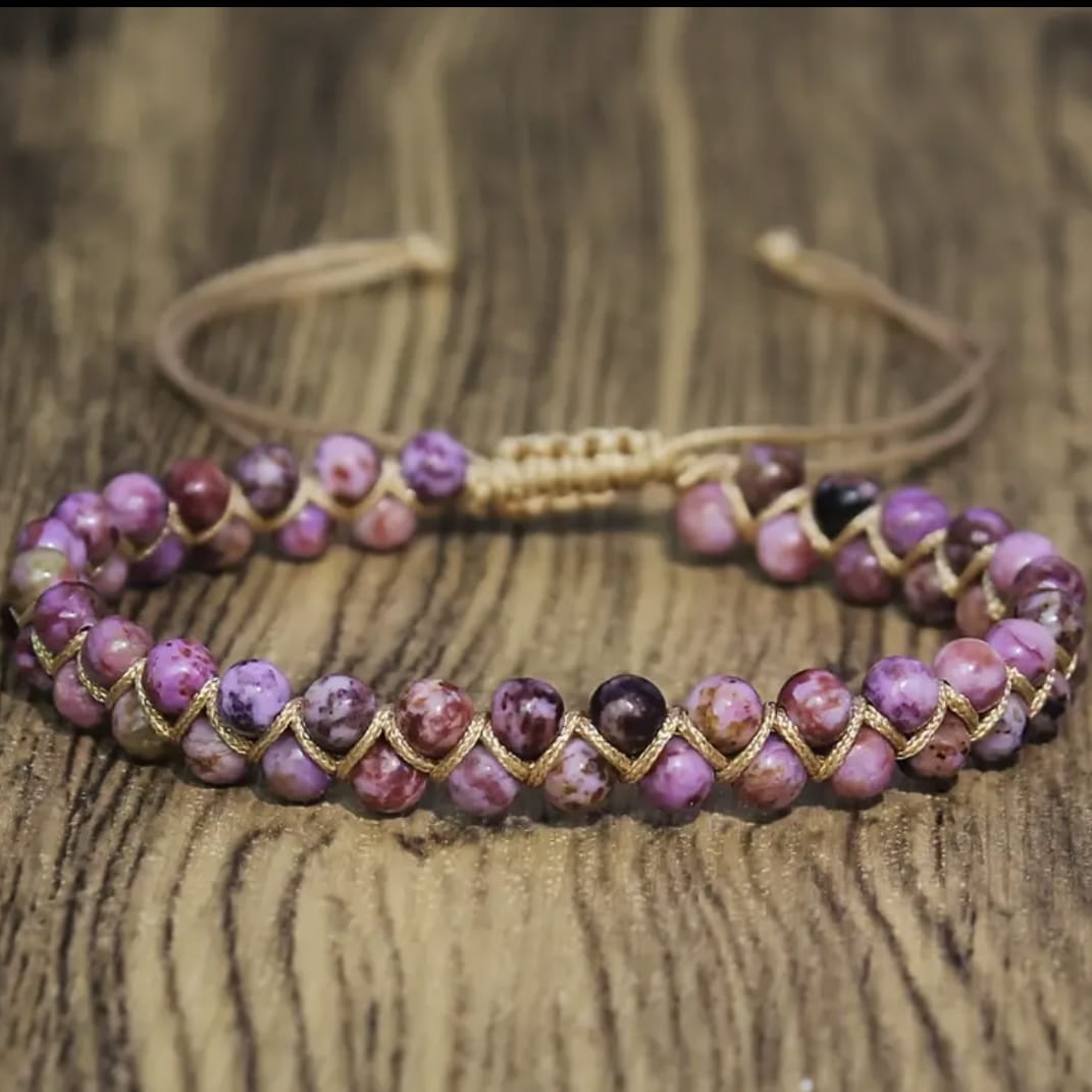 Bransoletka Berry to ręcznie wykonana ozdoba inspirowana naturą – soczysta, słodka i odważna jak letnie owoce. Powstała z drobnych, gładkich kamieni jaspisu cesarskiego w intensywnych odcieniach różu, fioletu i bordo, oplecionych połyskującą złotą nicią.