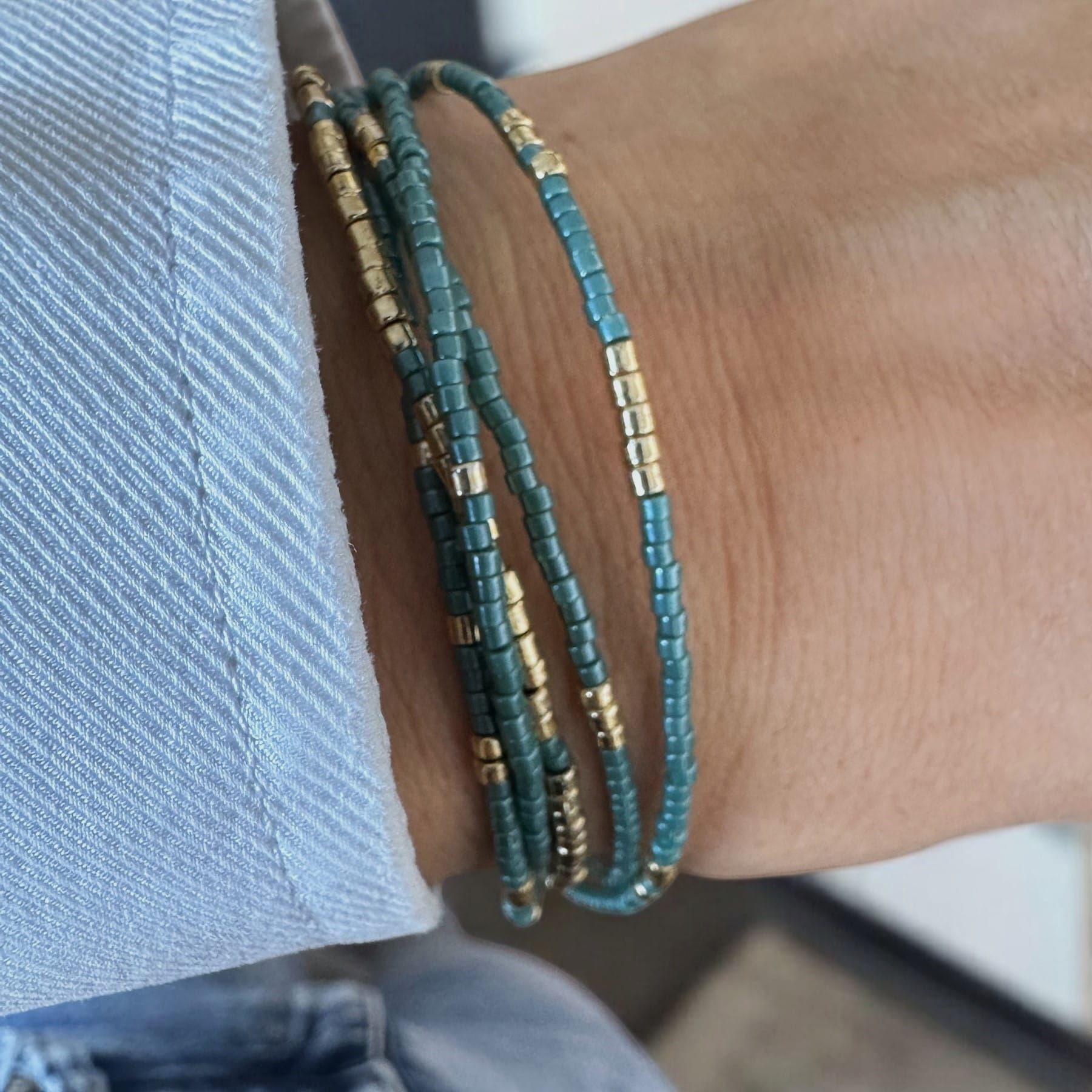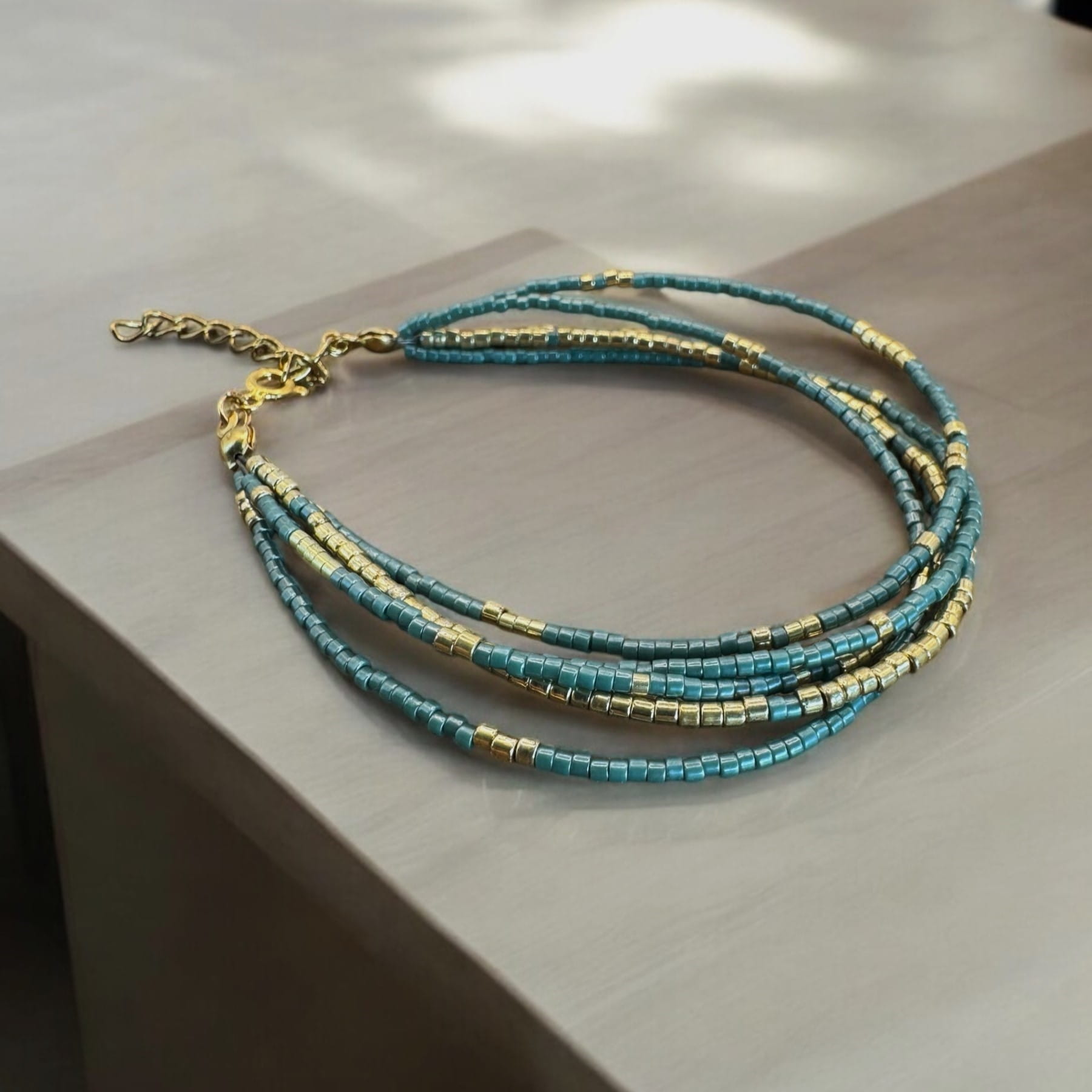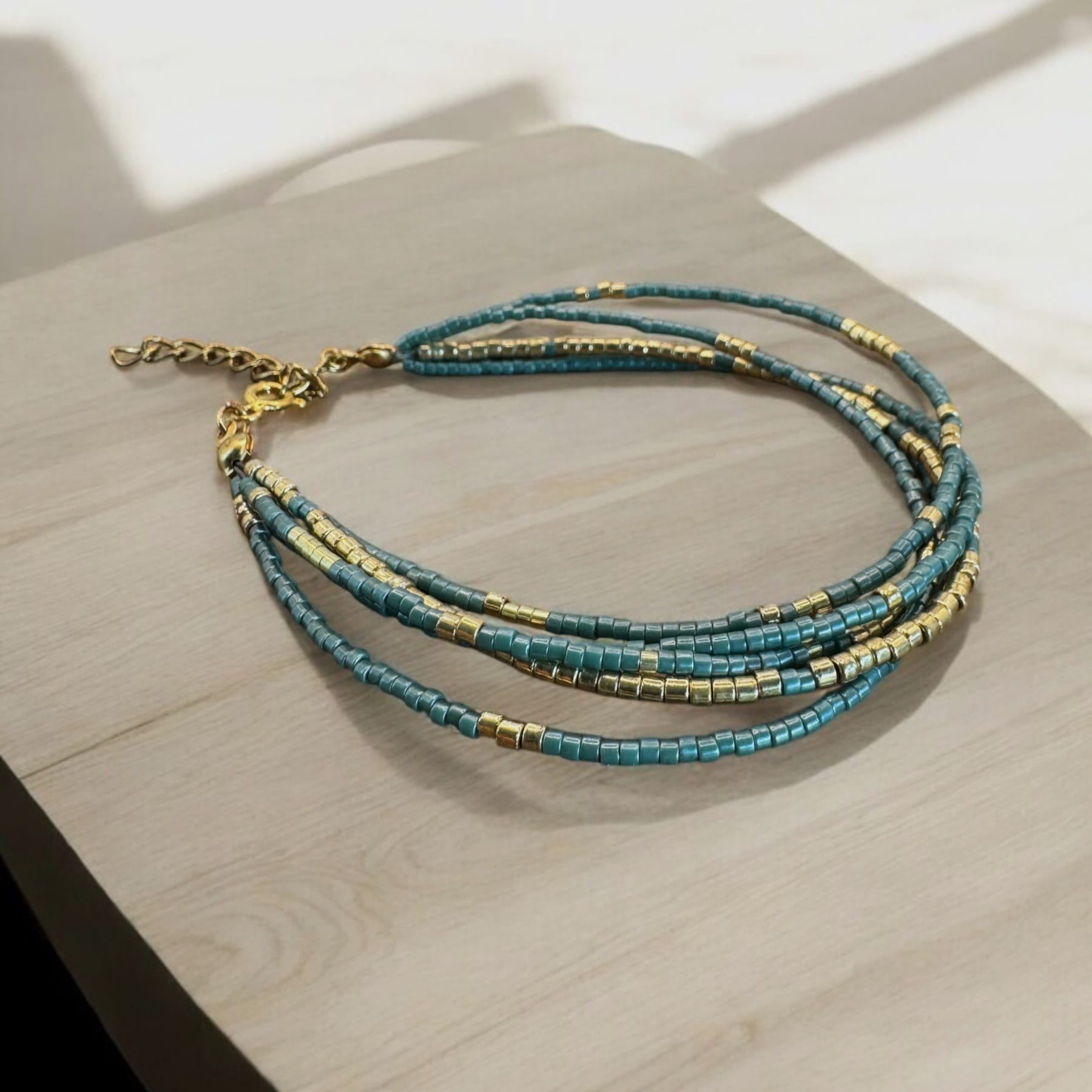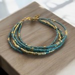 Bransoletka składa się z pięciu delikatnych żyłek, które zostały połączone w jedną harmonijną całość. Turkusowe odcienie pięknie komponują się ze złotymi akcentami, tworząc unikatowy wzór inspirowany morską głębią i promieniami słońca odbijającymi się od fal.