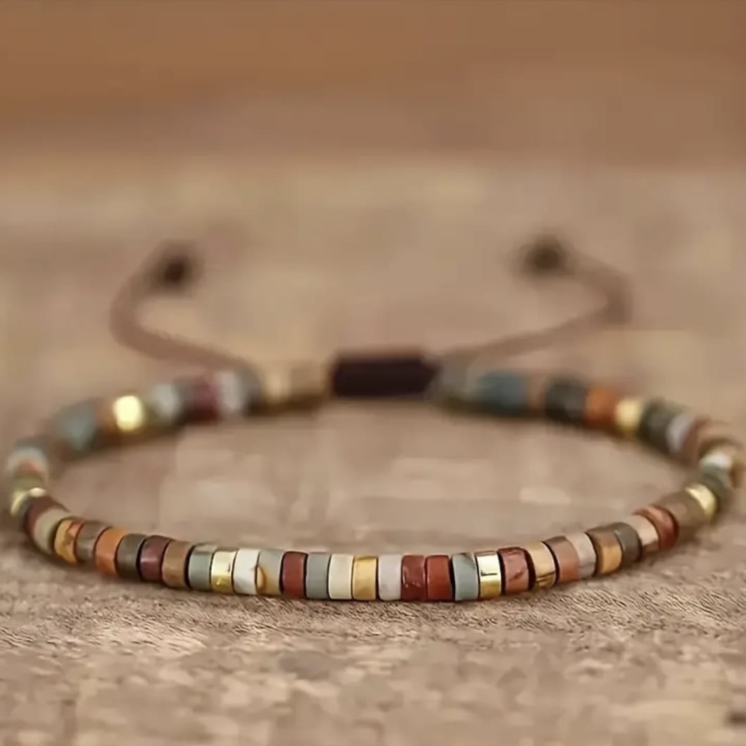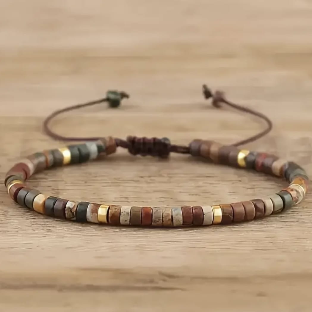 Ręcznie wykonana bransoletka z kamieni naturalnych w zgaszonych, ziemistych odcieniach to idealny dodatek dla osób ceniących minimalistyczną, ale wyrazistą biżuterię. Mieszanka jaspisu, hematytu i innych naturalnych minerałów tworzy niepowtarzalny wzór – każdy koralik jest inny, dzięki czemu każda bransoletka jest unikatowa.