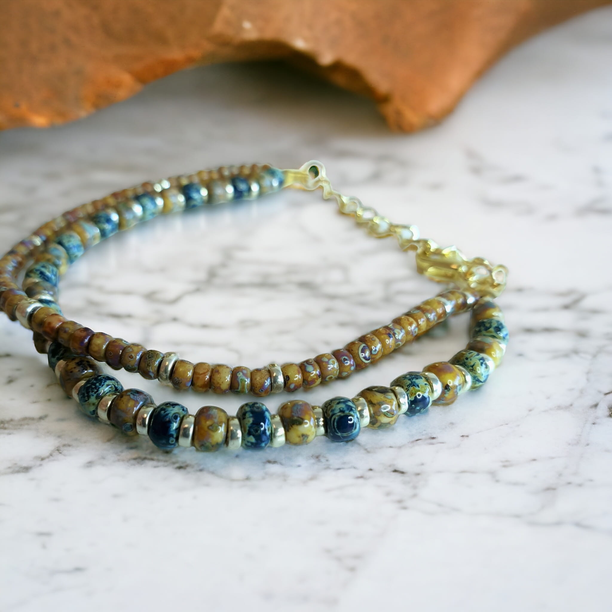 *Koraliki są koloru brązowo - zielonego co dodaje bransoletce wyjątkowego charakteru i naturalnego uroku.