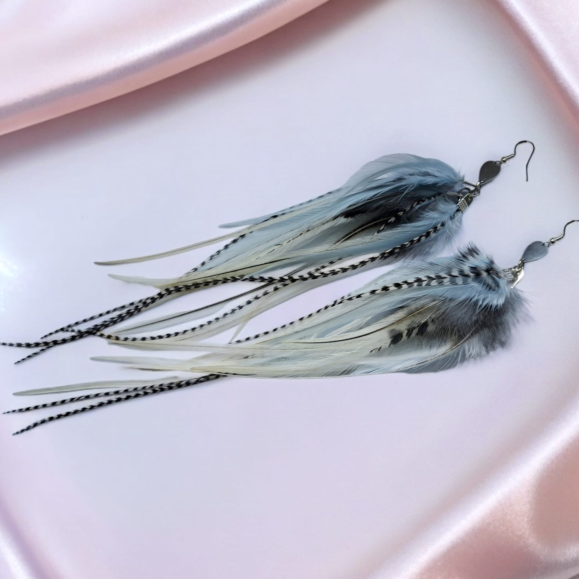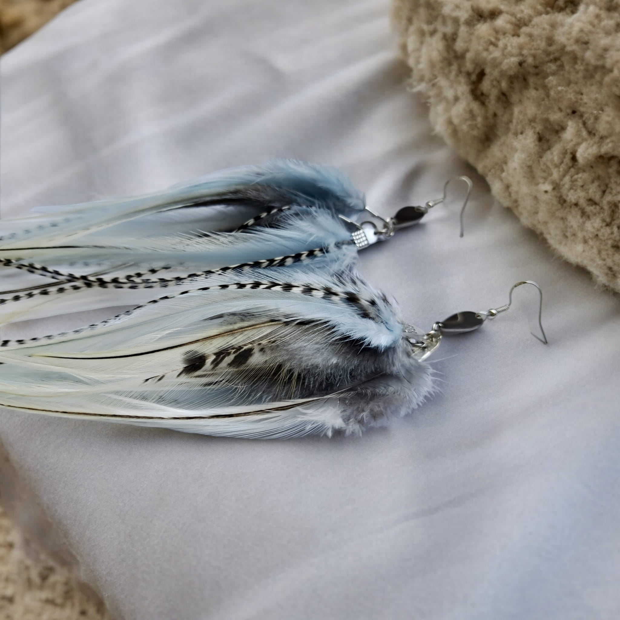 - kolczyki z piór Baby Blue zostały przygotowane ze starannie wyselekcjonowanych piór, które w swojej uprzejmości udostępnił Ci kogut oraz bażant;