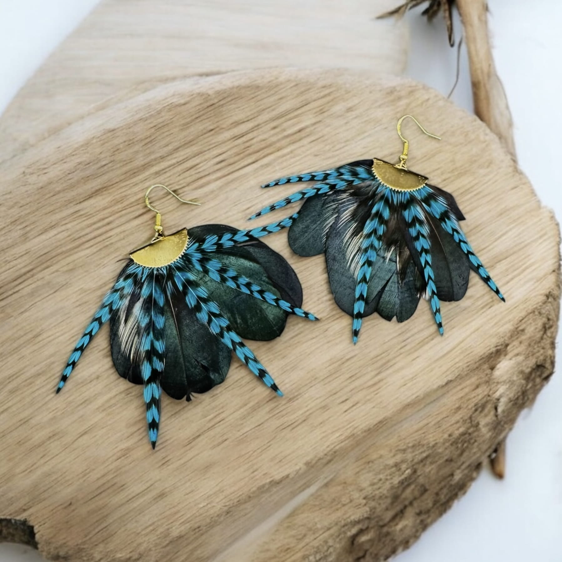 Kolczyki z piór Blue Eclipse to wyraziste połączenie dzikiej natury i elegancji. Ich półokrągła forma przypomina promienie księżyca, a turkusowo-czarne pióra dodają im tajemniczego, lekko etnicznego charakteru. Inspirowane harmonią natury, są idealnym wyborem dla kobiet ceniących oryginalne dodatki i boho estetykę.