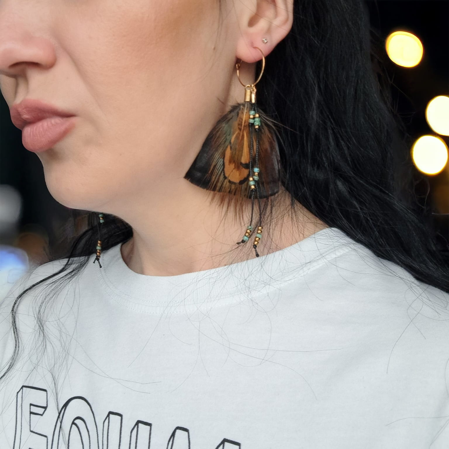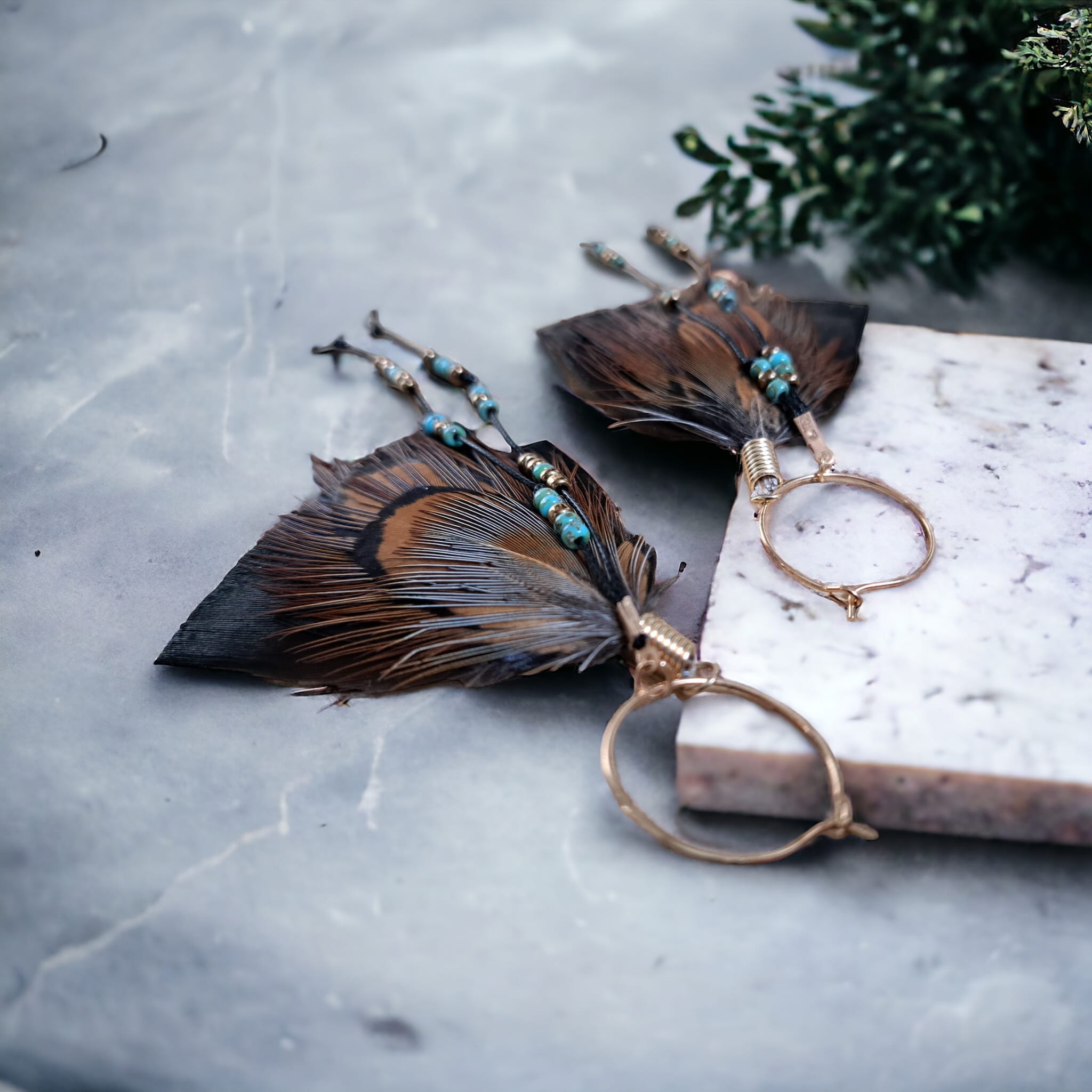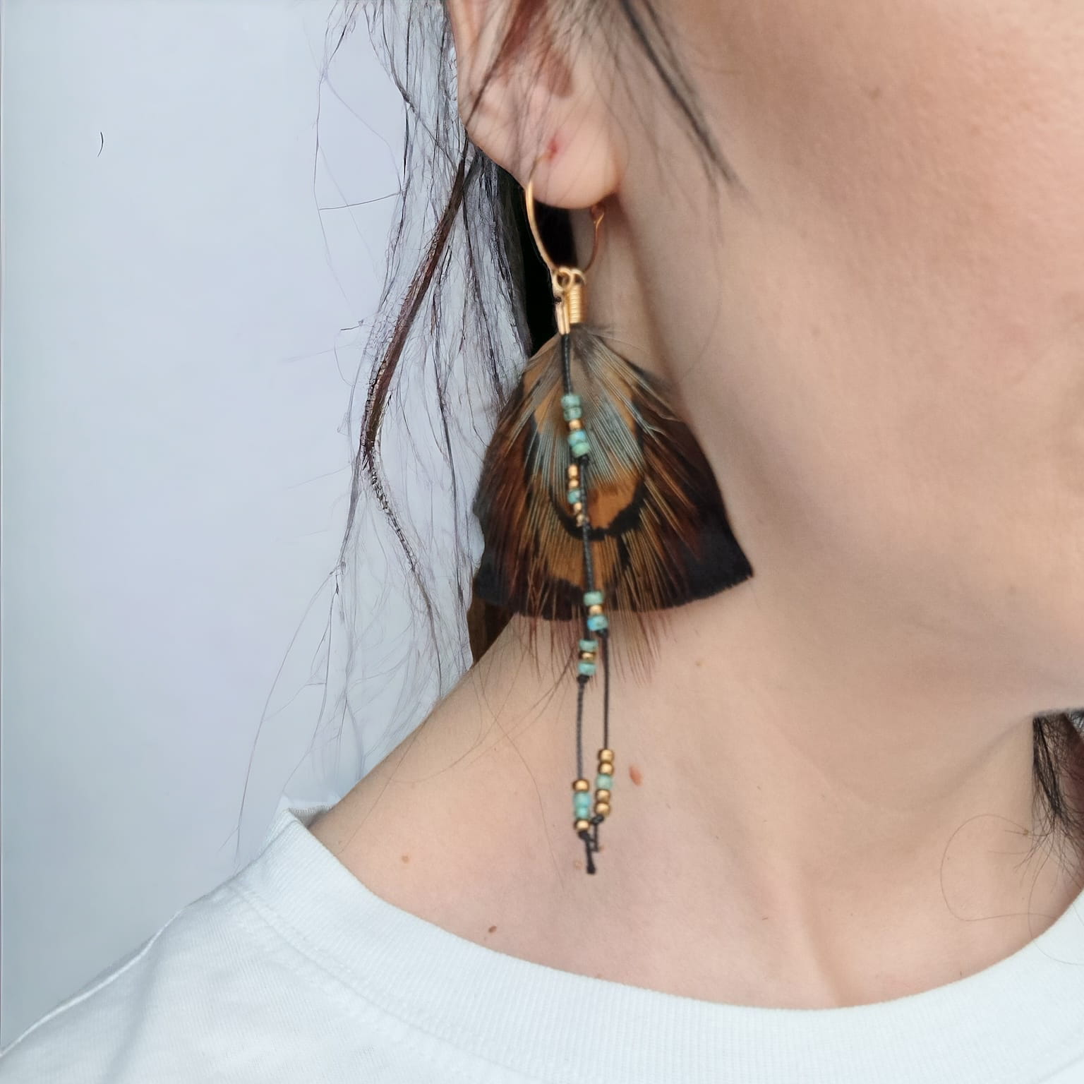 - Do przygotowania kolczyków z piór June starannie wybraliśmy najpiękniejsze z piór, które zawdzięczamy uprzejmości bażanta diamentowego oraz indyka czarnego.