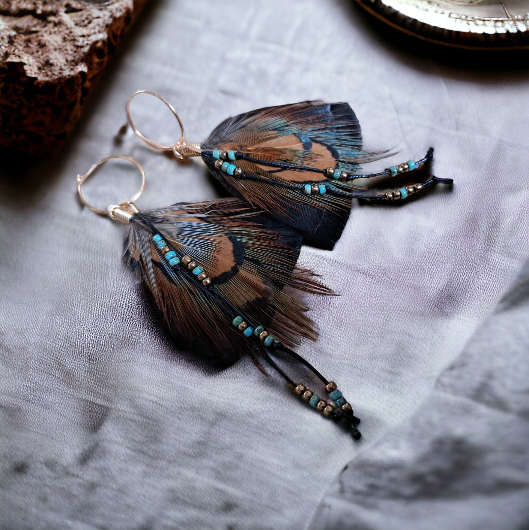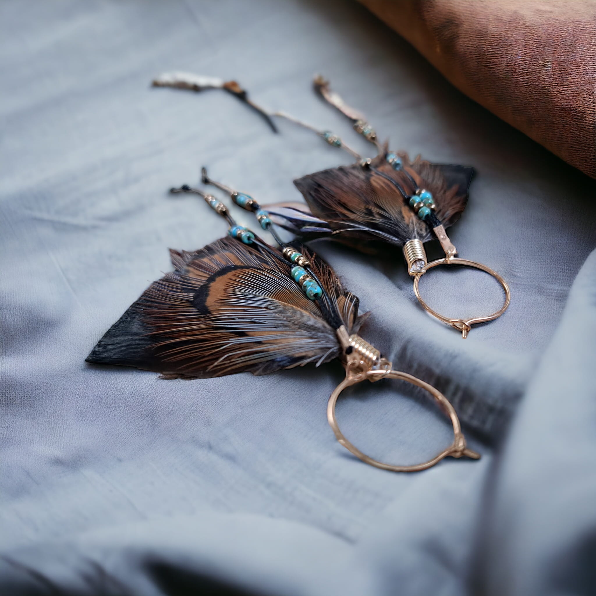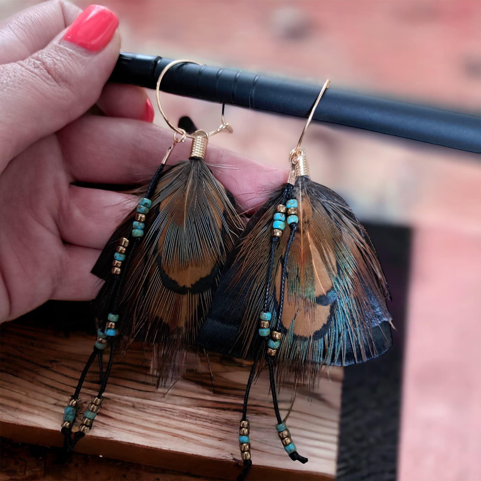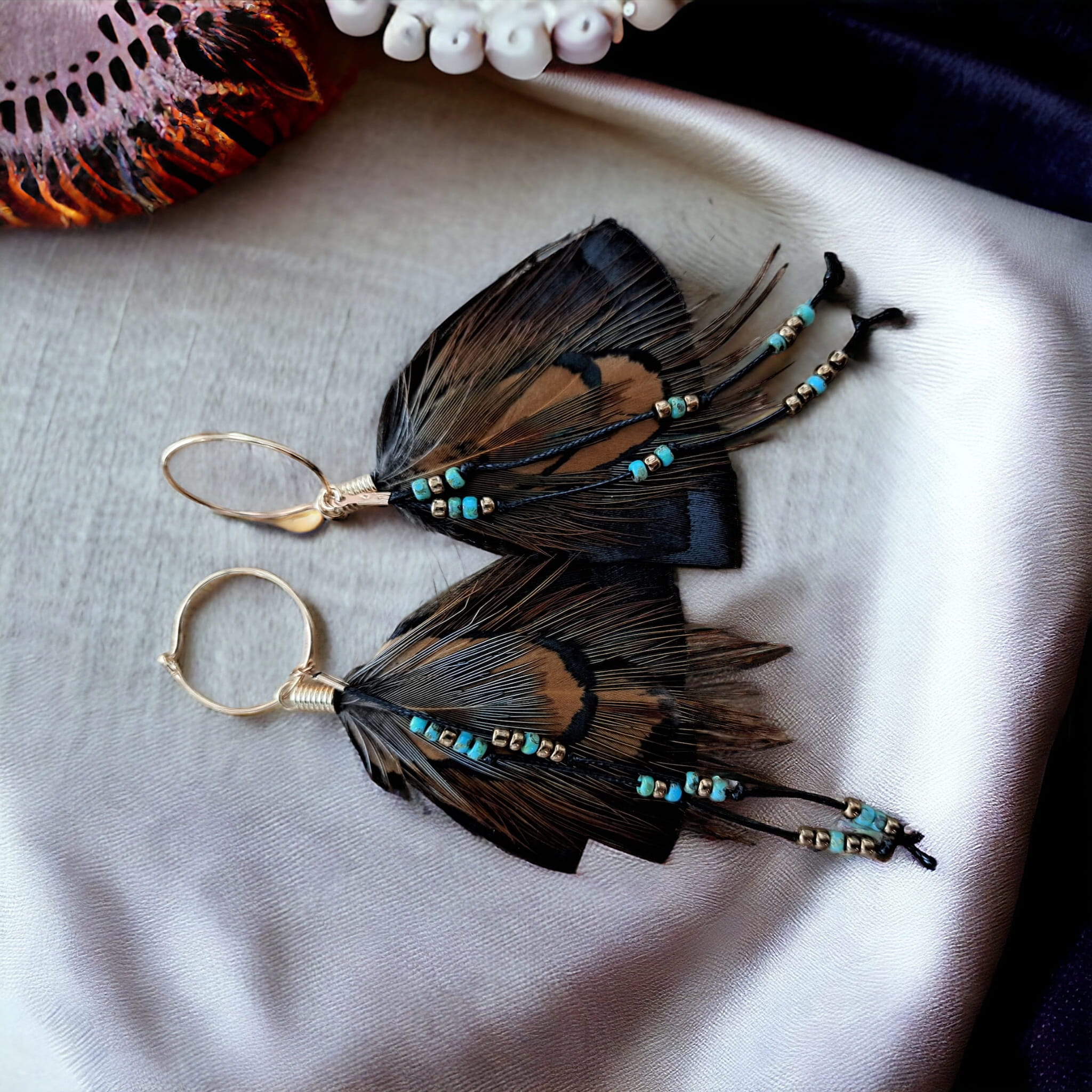 - Do przygotowania kolczyków z piór June starannie wybraliśmy najpiękniejsze z piór, które zawdzięczamy uprzejmości bażanta diamentowego oraz indyka czarnego.