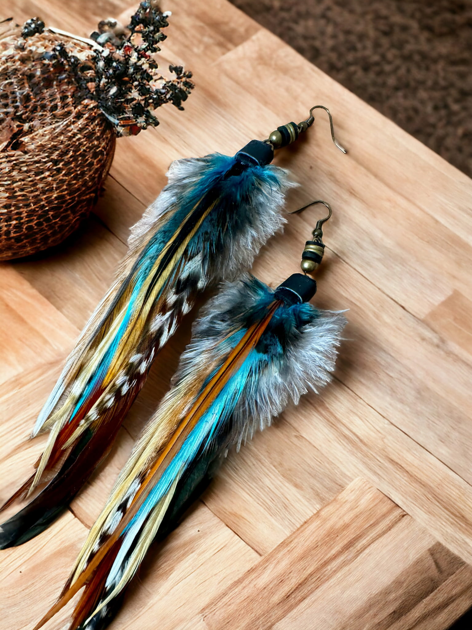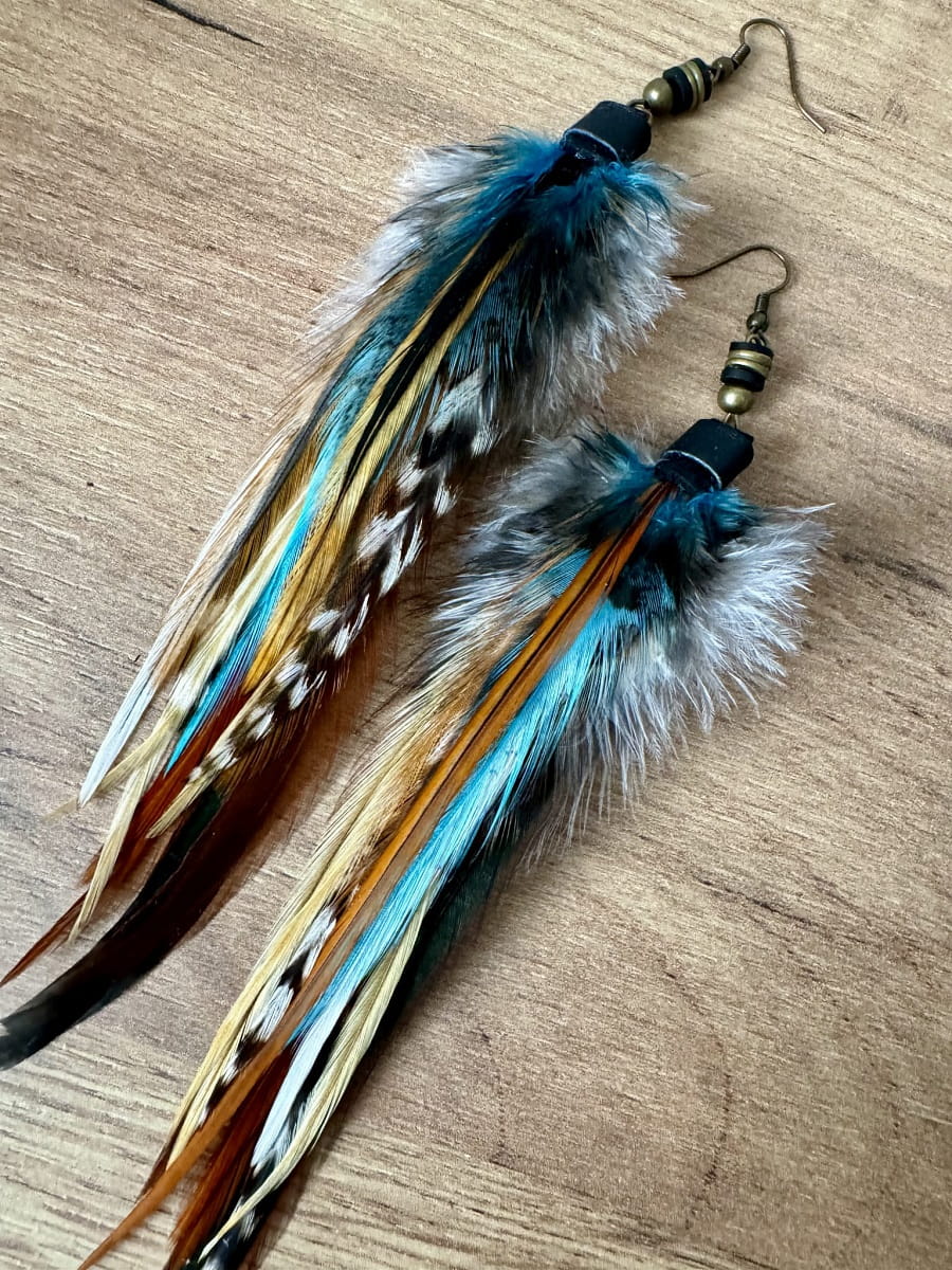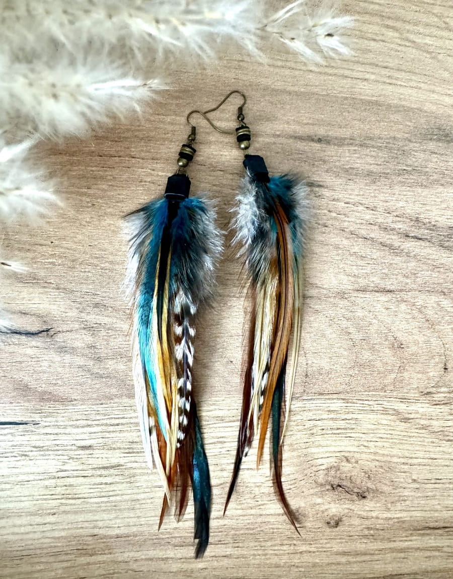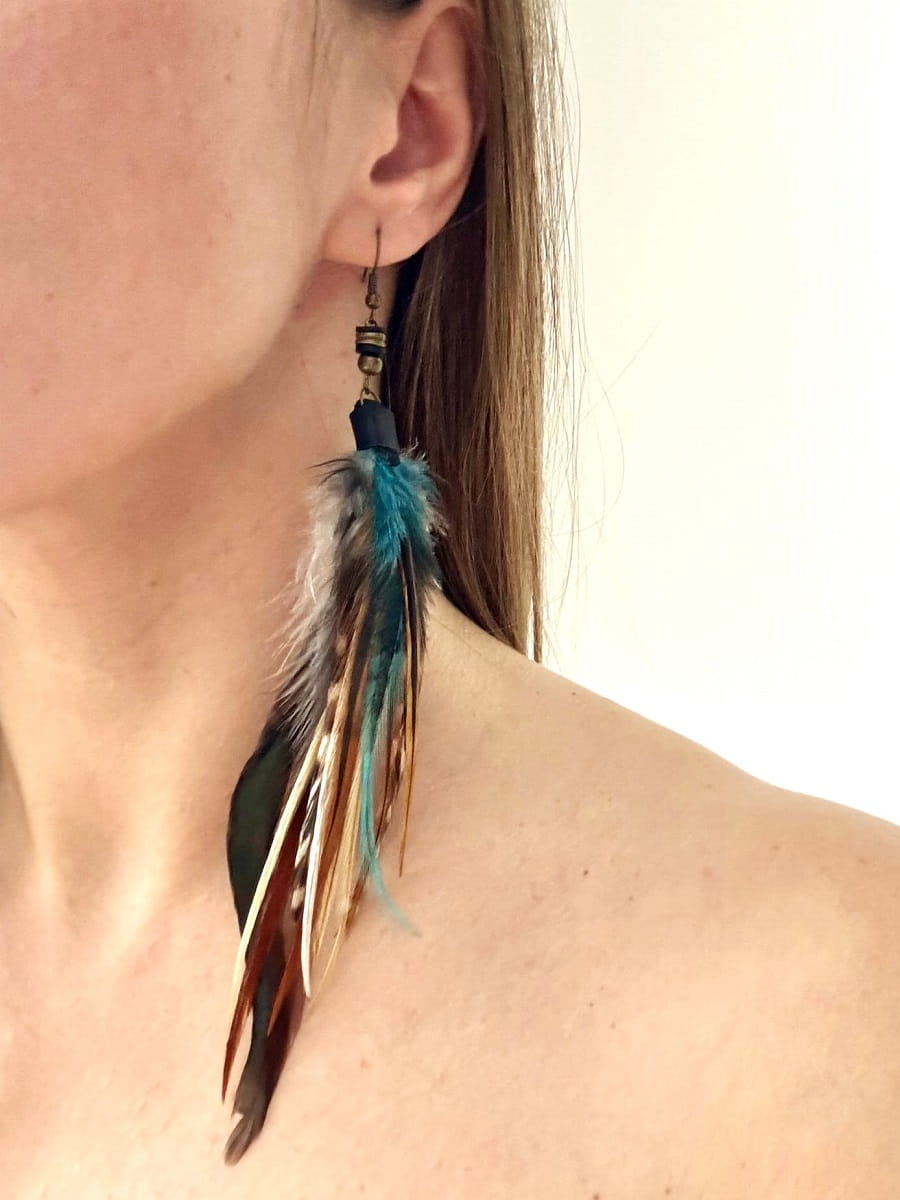 - Wymiary koczyków z piór Moon to w przybliżeniu: 15 cm, poszczególne modele mogą się nieznacznie różnić w zależności od długości piór.
