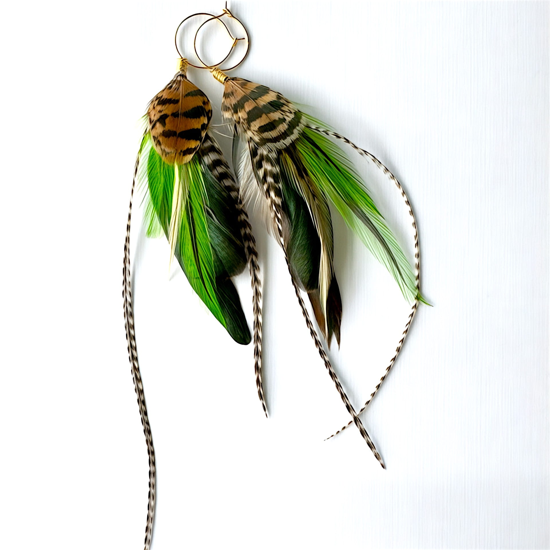 - Do przygotowania kolczyków z piór Olena Green starannie wybraliśmy najpiękniejsze z piór, które zawdzięczamy uprzejmości koguta oraz paw.