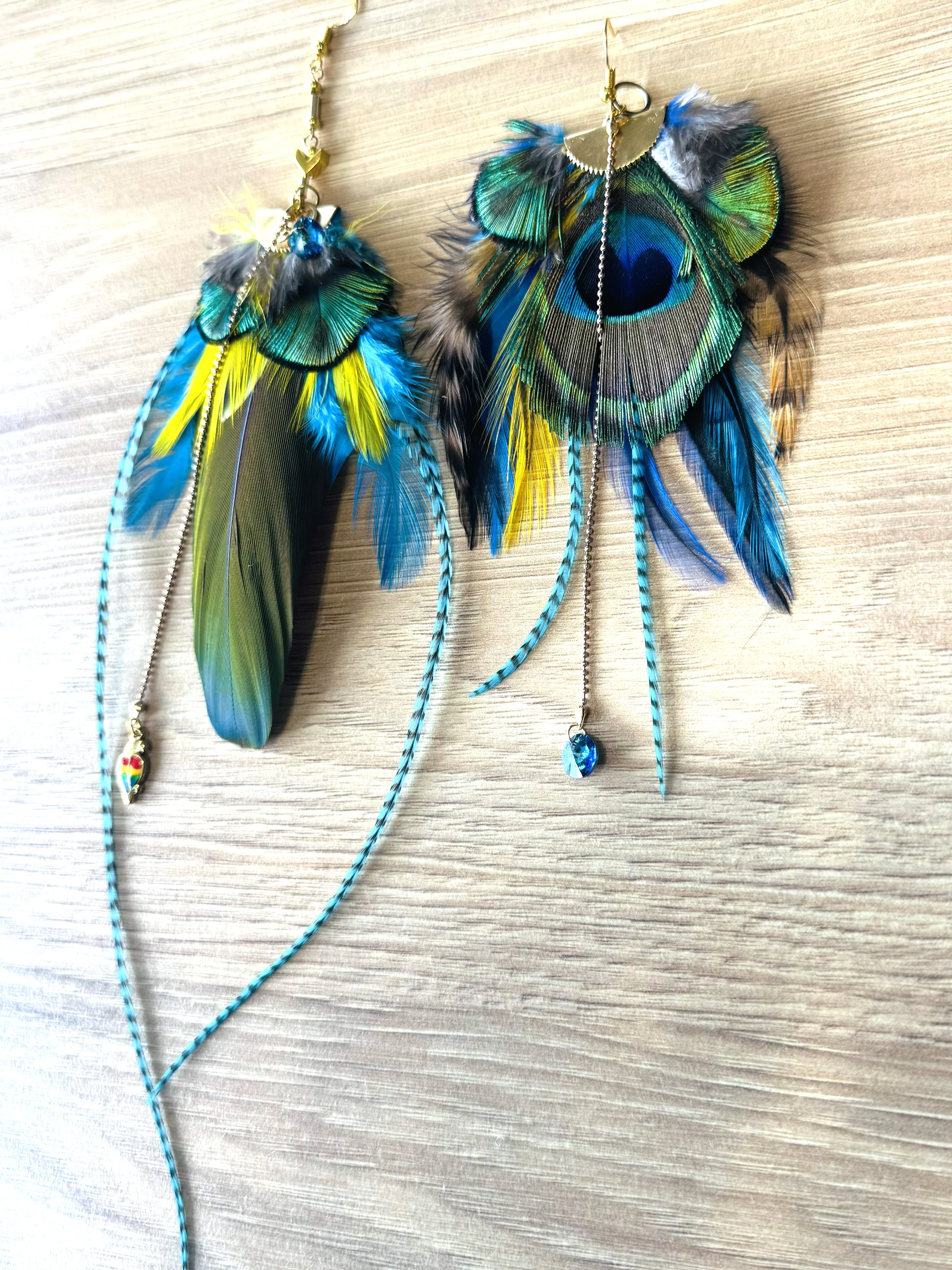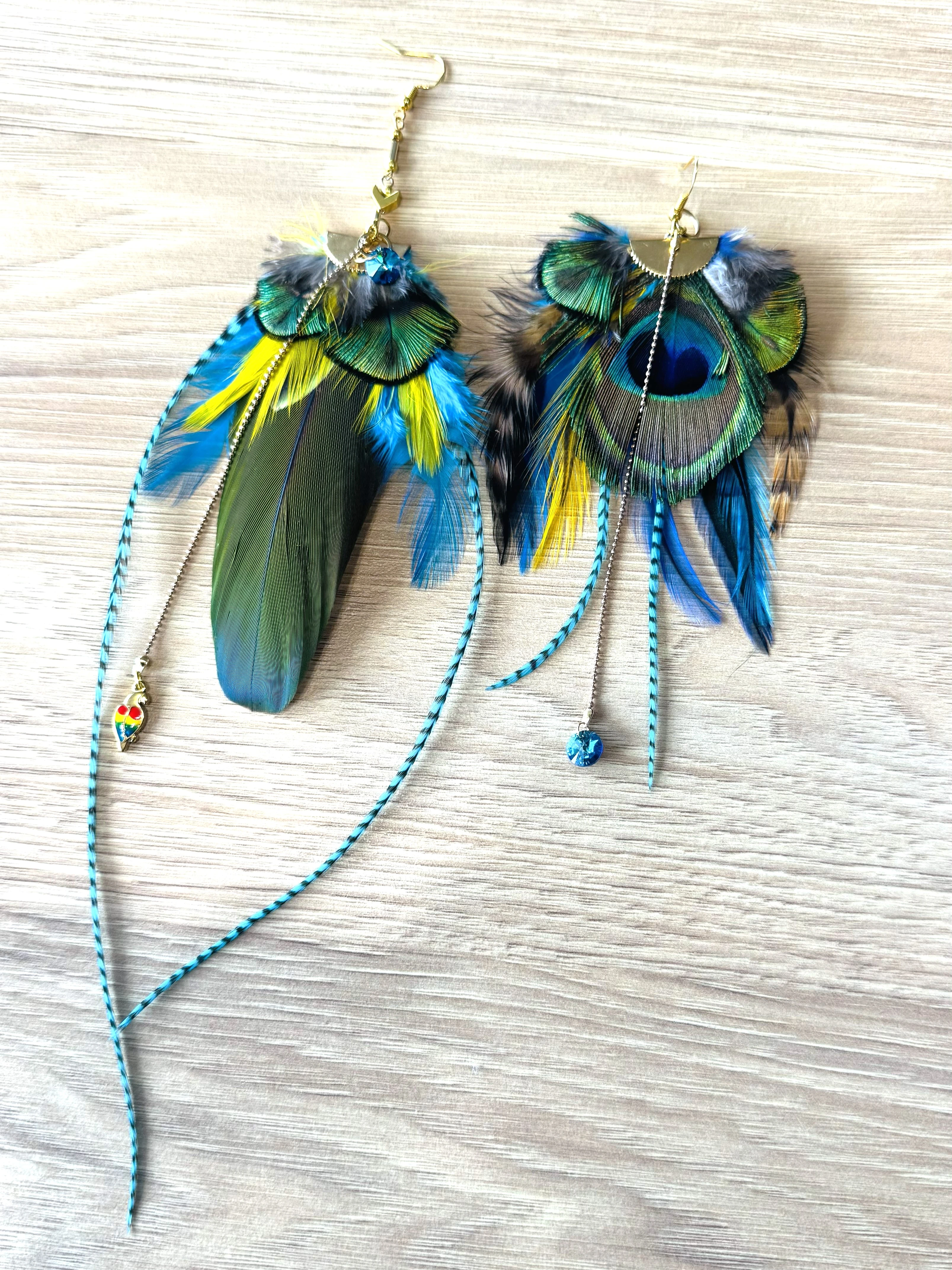 Długość: Kolczyki nie są symetryczne papuga ma około 18 cm natomiast koczyki Paw 15 cm – długa, smukła forma wysmuklająca szyję.