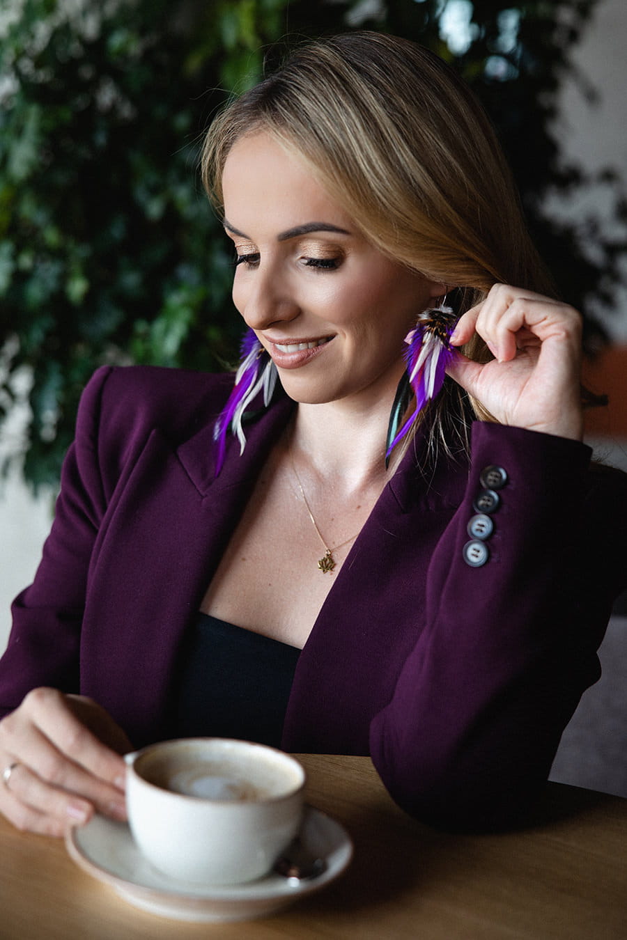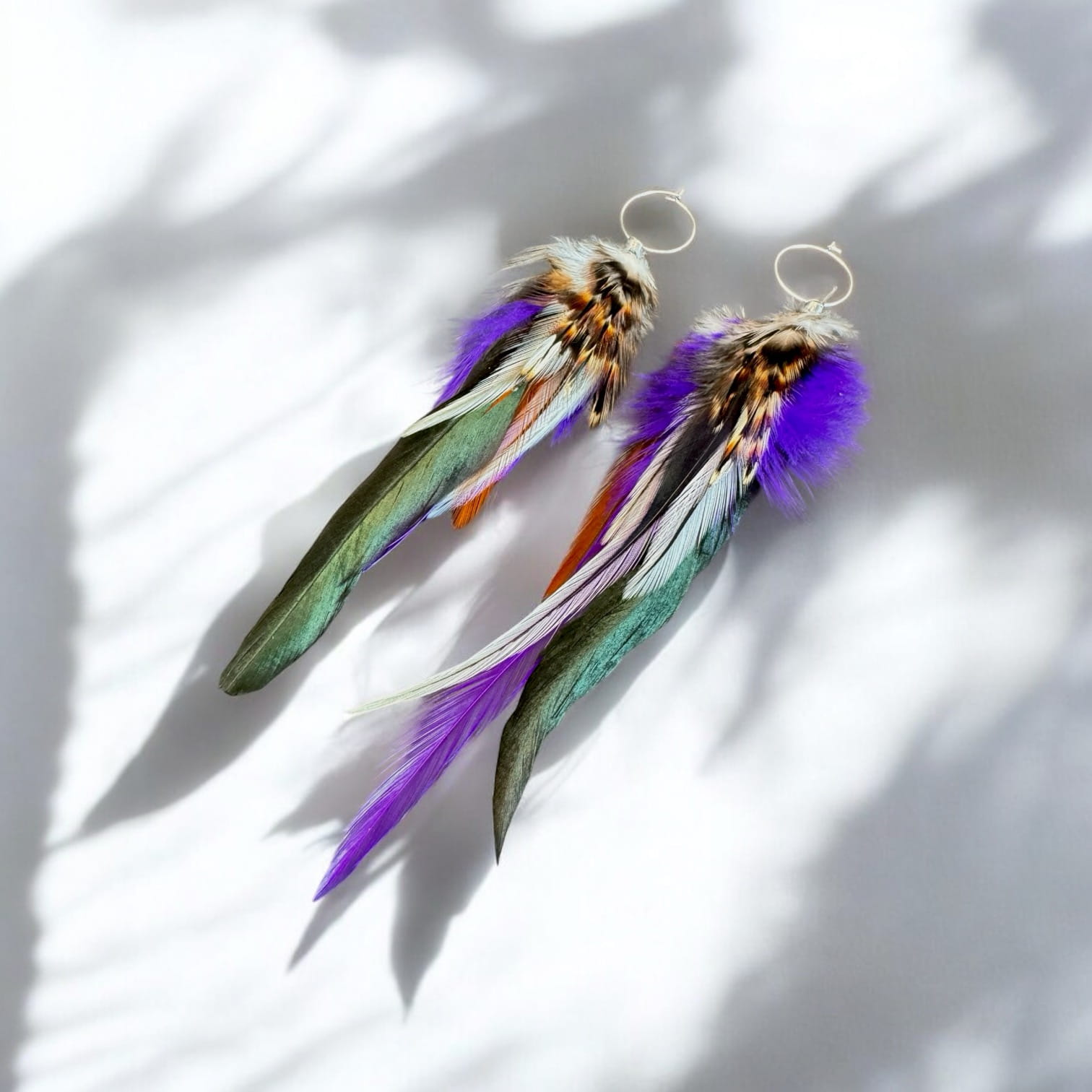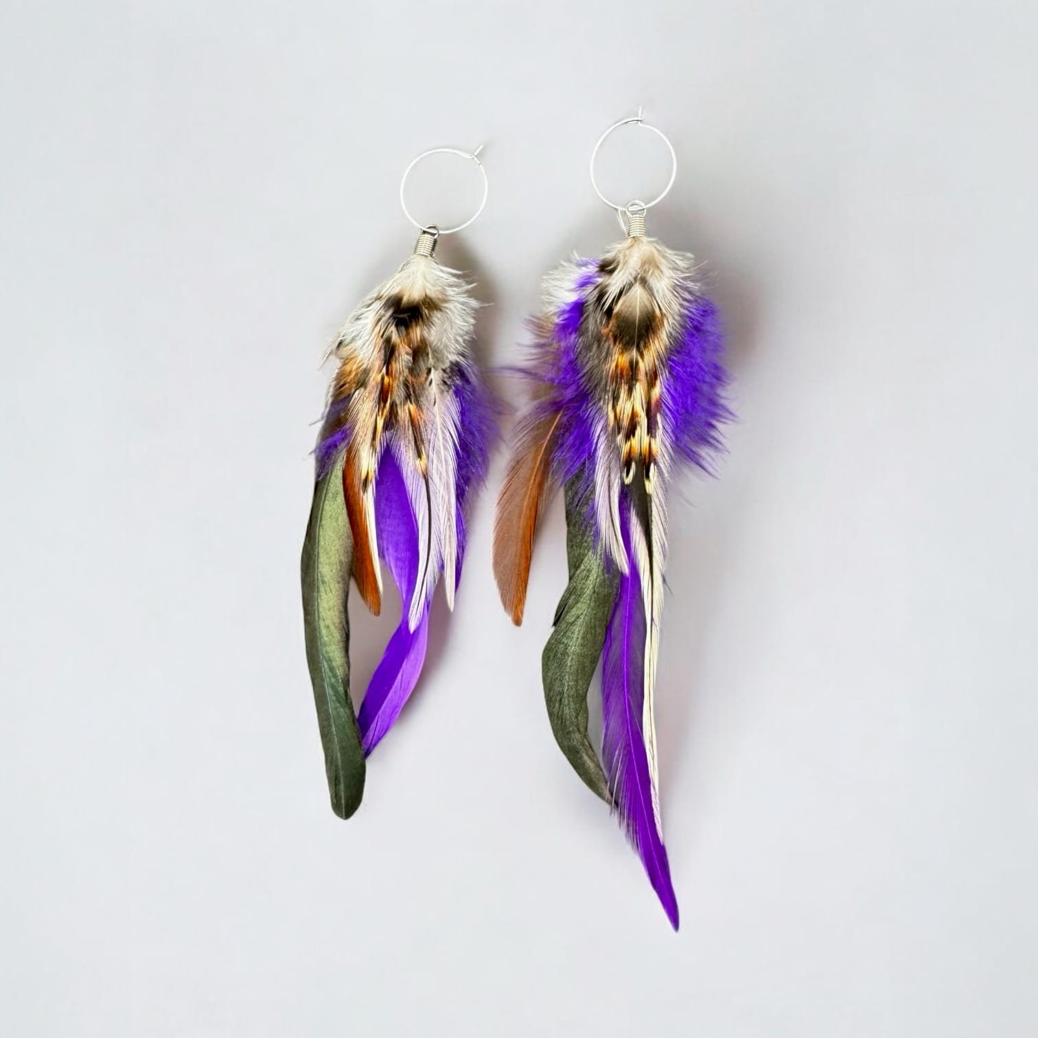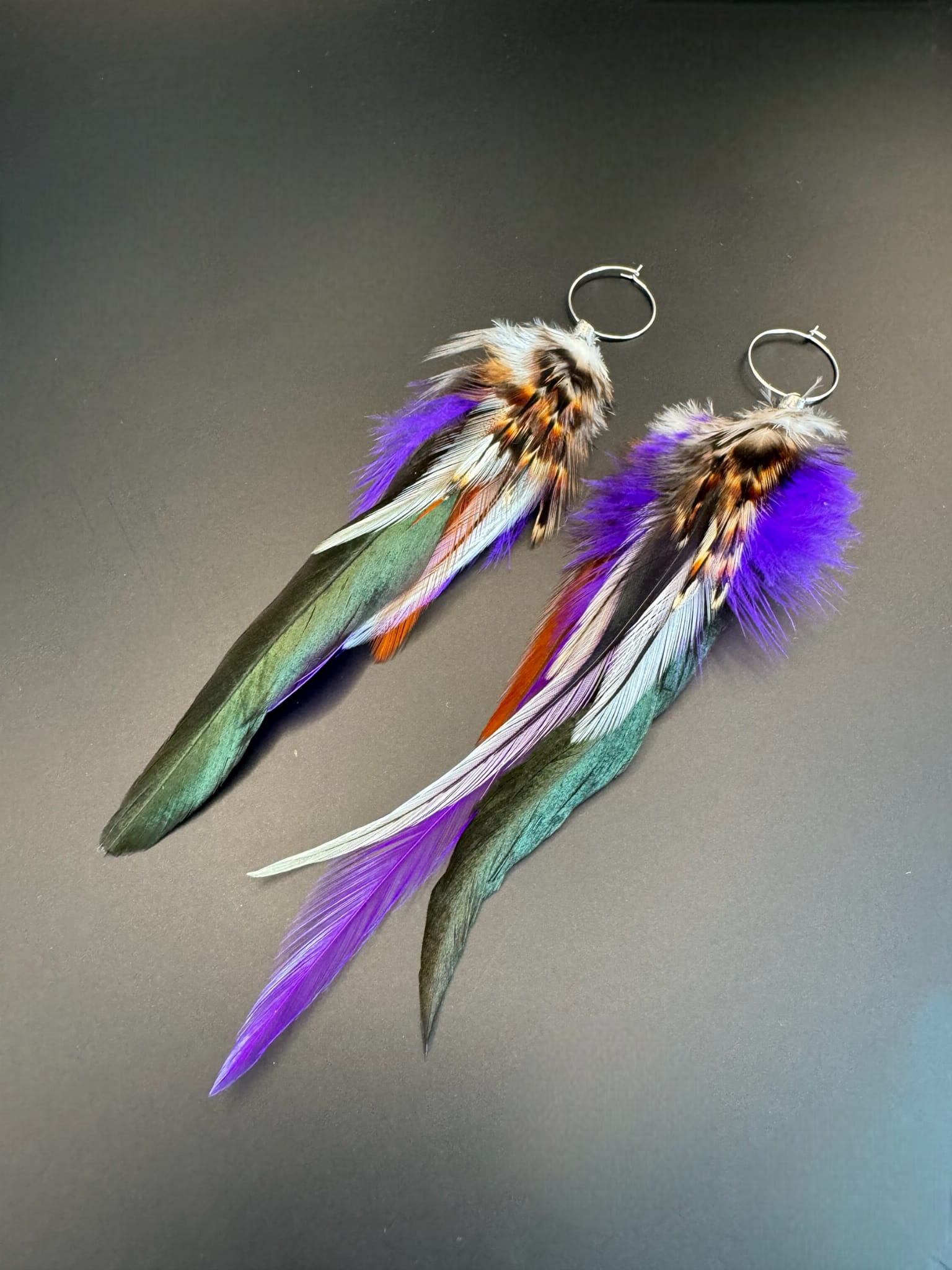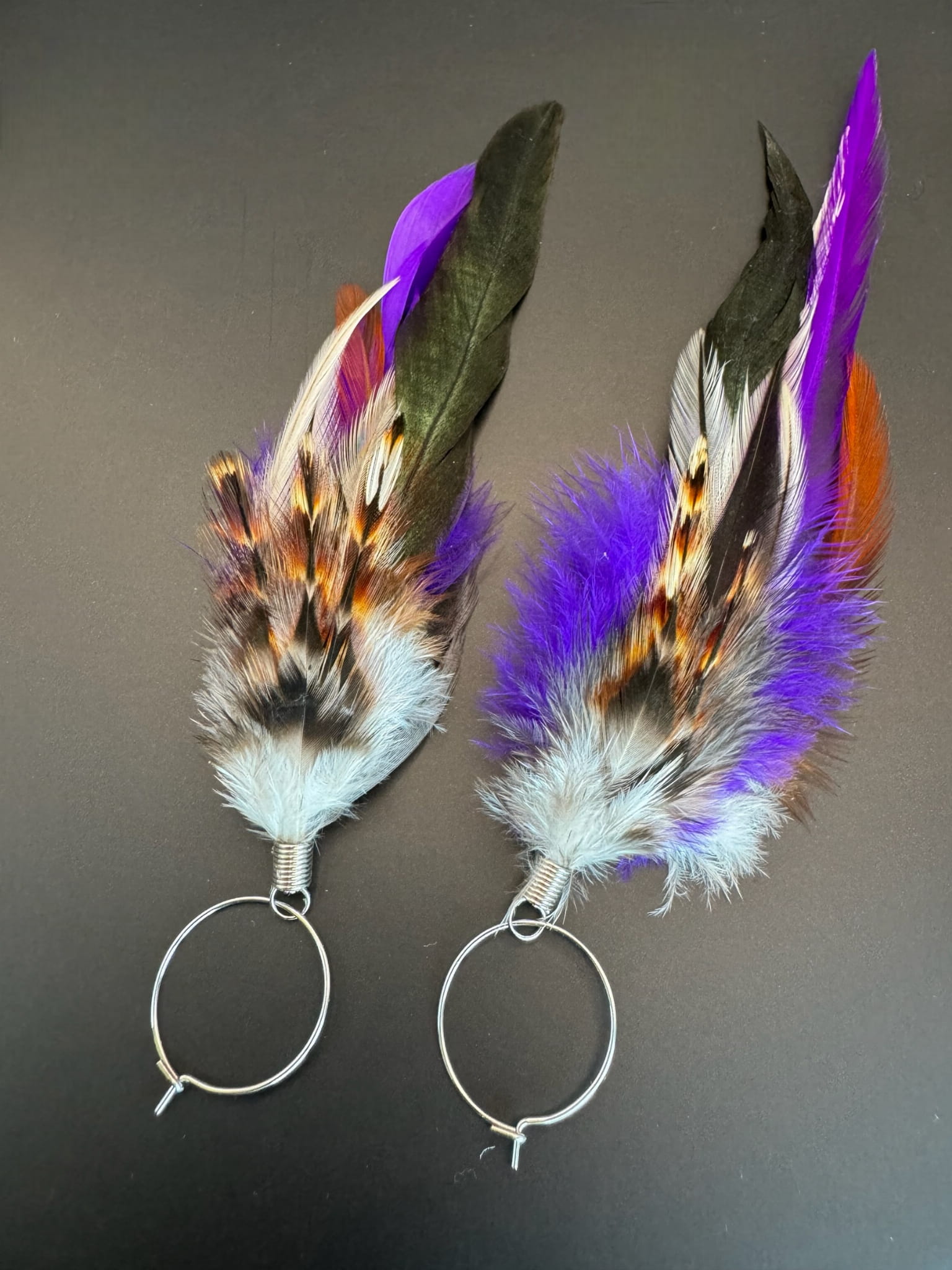 - Do przygotowania kolczyków z piór Purple starannie wybraliśmy najpiękniejsze z piór, które zawdzięczamy uprzejmości koguta oraz bażanta.
