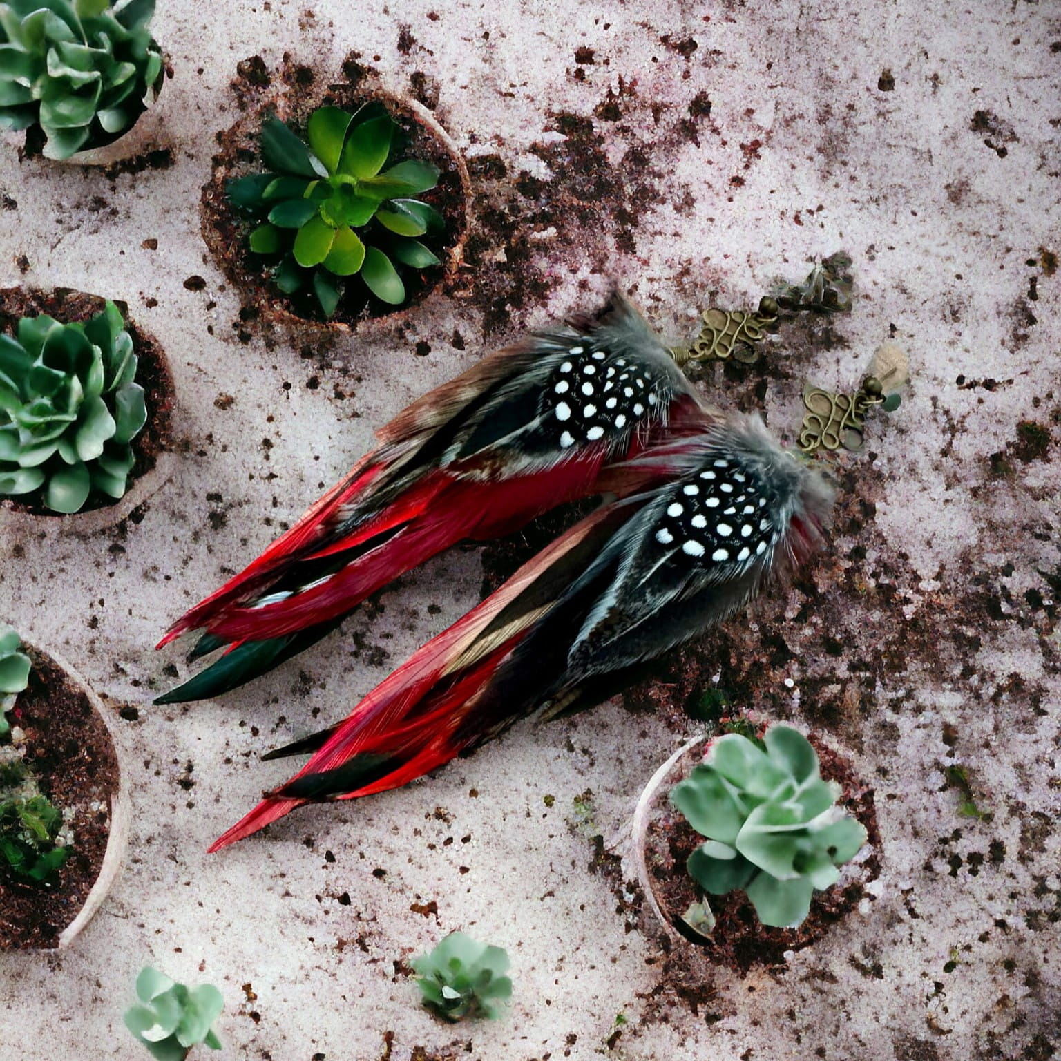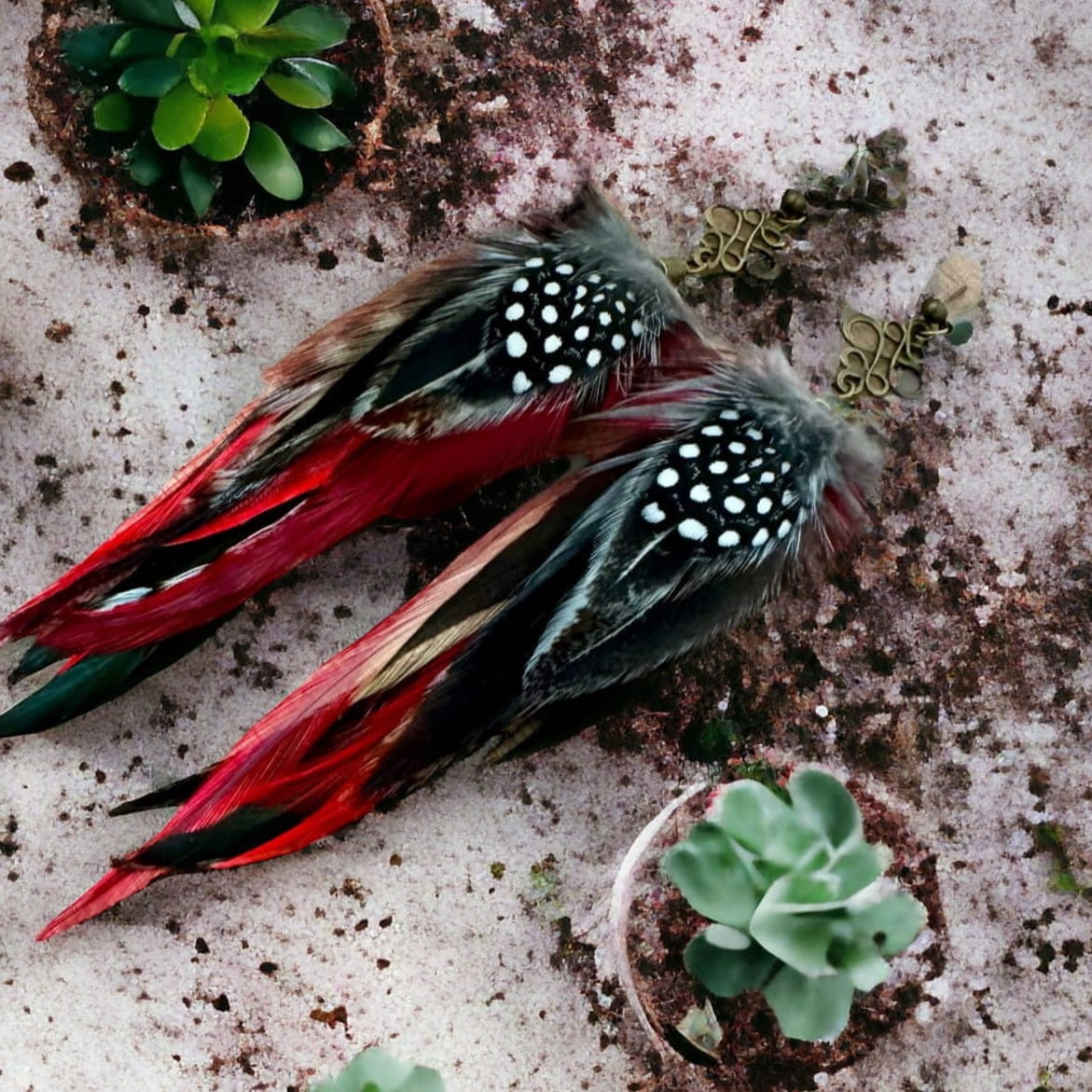 - Do przygotowania kolczyków z piór Redpepper starannie wybraliśmy najpiękniejsze z piór, które zawdzięczamy uprzejmości koguta oraz perliczki.