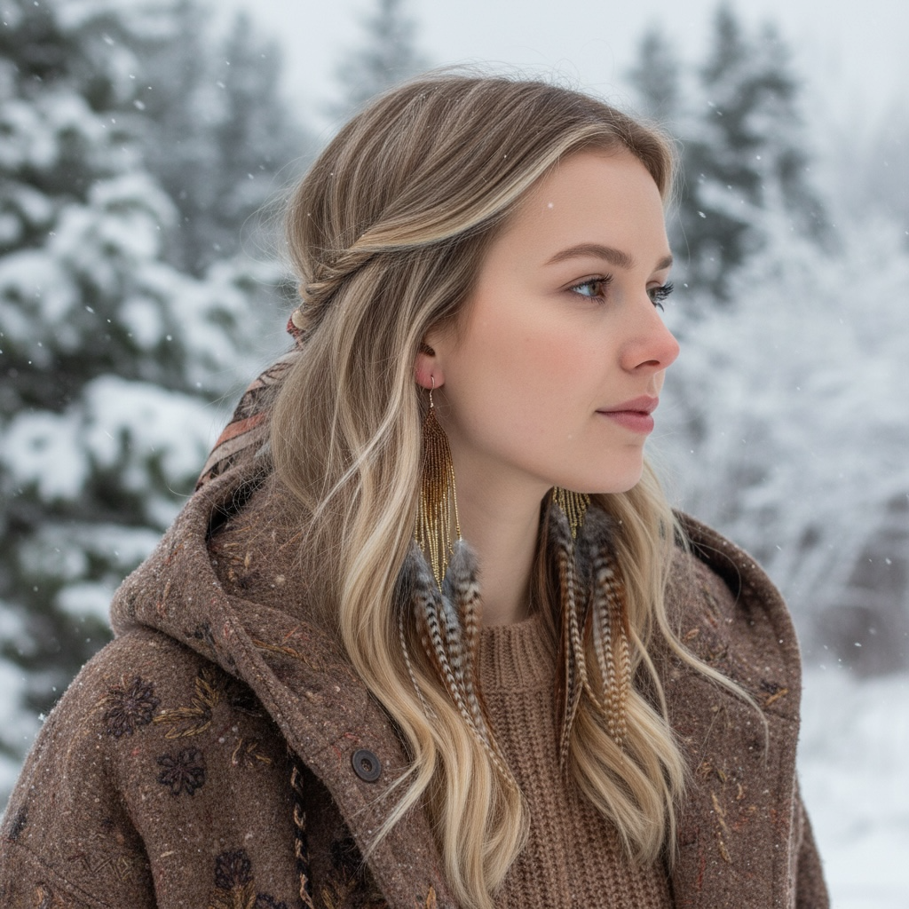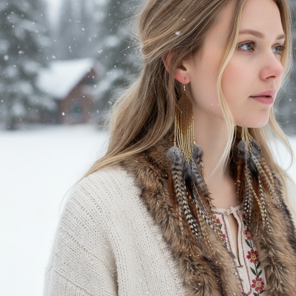 Etniczny sznyt: Kaskadowy układ piór nadaje im wyjątkowej dynamiki – kolczyki „żyją” przy każdym Twoim ruchu, subtelnie muskając ramiona.