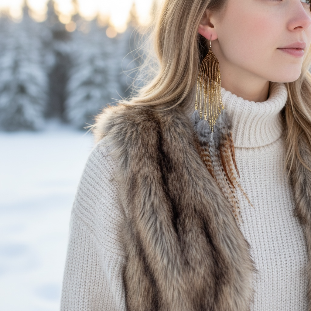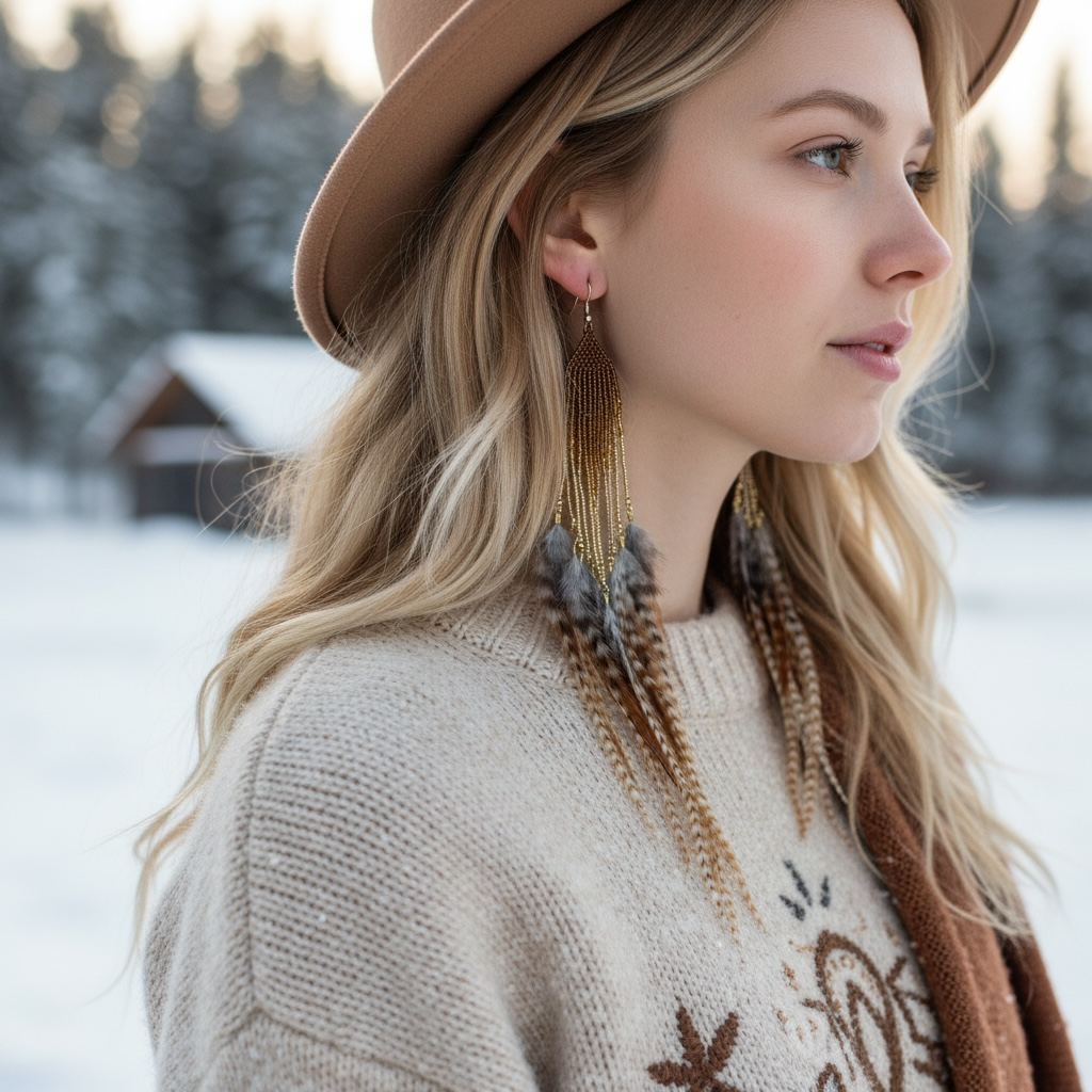 Odkryj biżuterię, która jest celebracją rzemiosła i natury. Model Golden Hawk to unikatowe połączenie misternego beadingu (haftu koralikowego) oraz długich, prążkowanych piór o głębokich odcieniach brązu, beżu i szarości. To propozycja dla kobiet, które szukają dodatków z duszą, potrafiących całkowicie odmienić nawet najprostszą stylizację.
