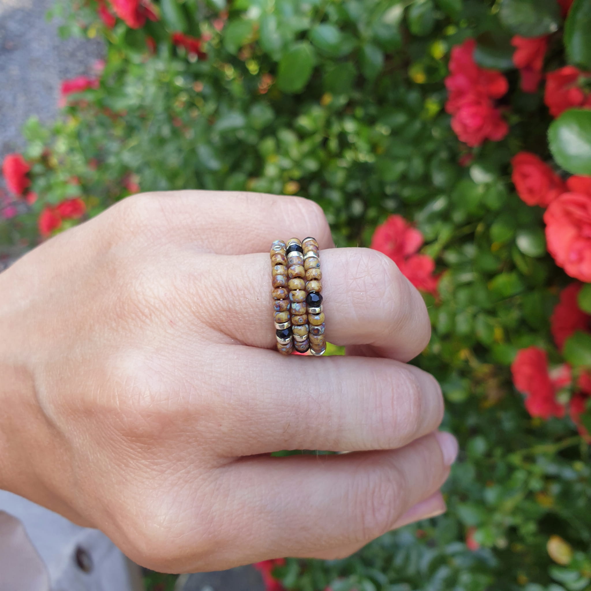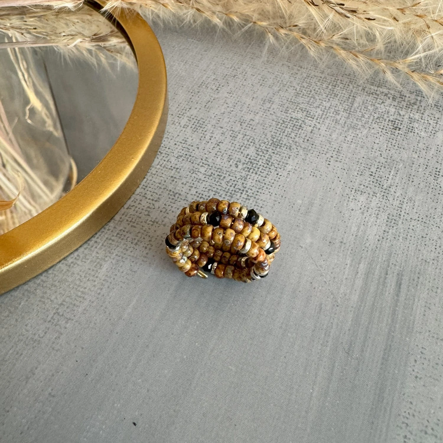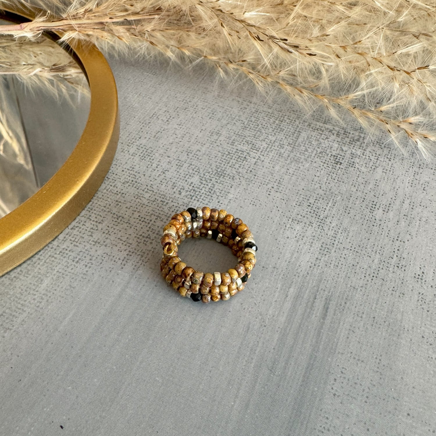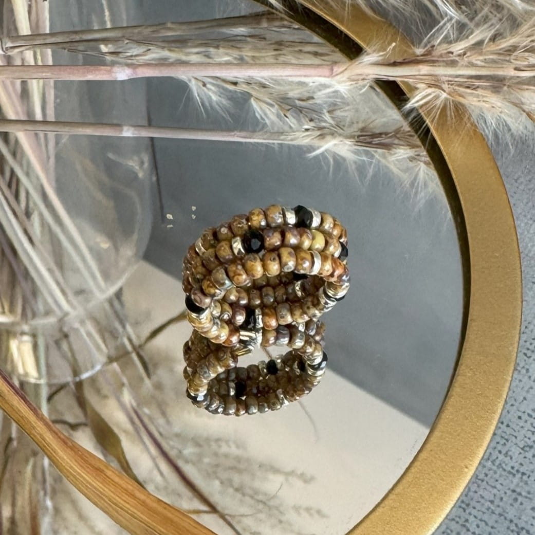 Głównym elementem tego pierścionka są przepiękne koraliki o różnych odcieniach brązów oraz beżów które tworzą delikatne i subtelne wzory. Koraliki są starannie dobrane, tak aby stworzyć harmonijną kompozycję kolorystyczną, która przyciąga uwagę i dodaje uroku.