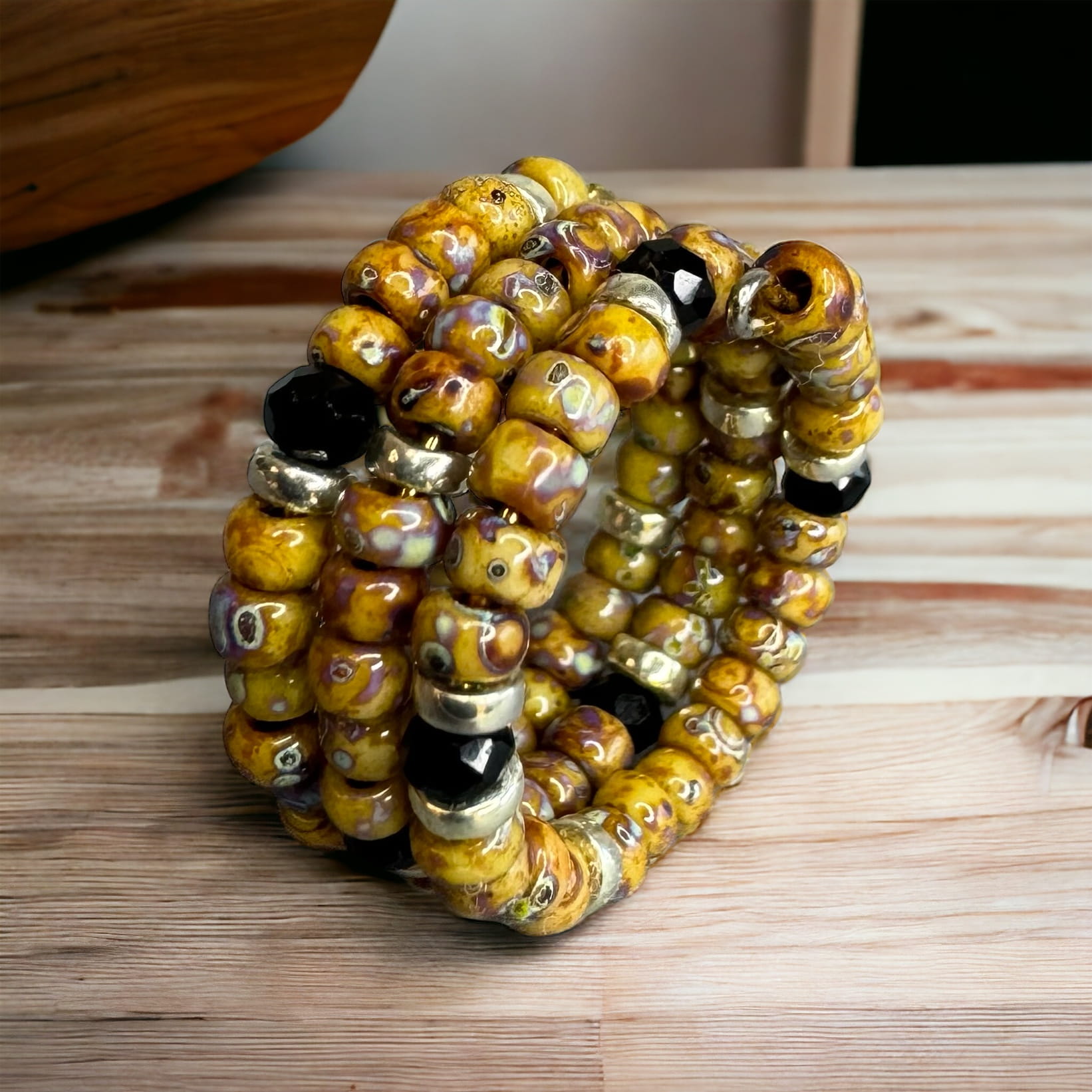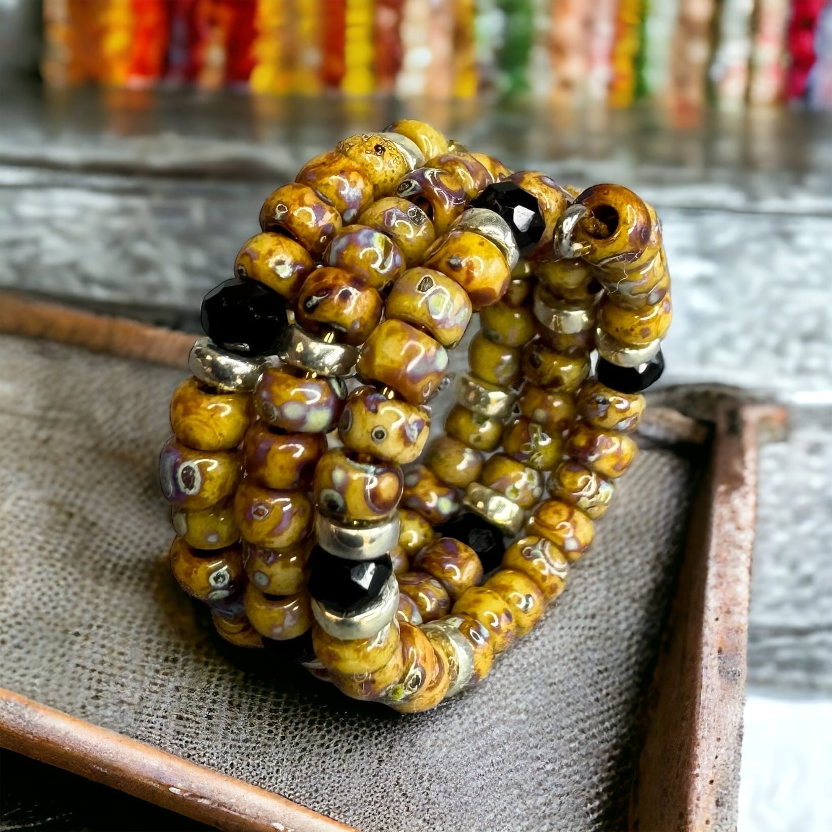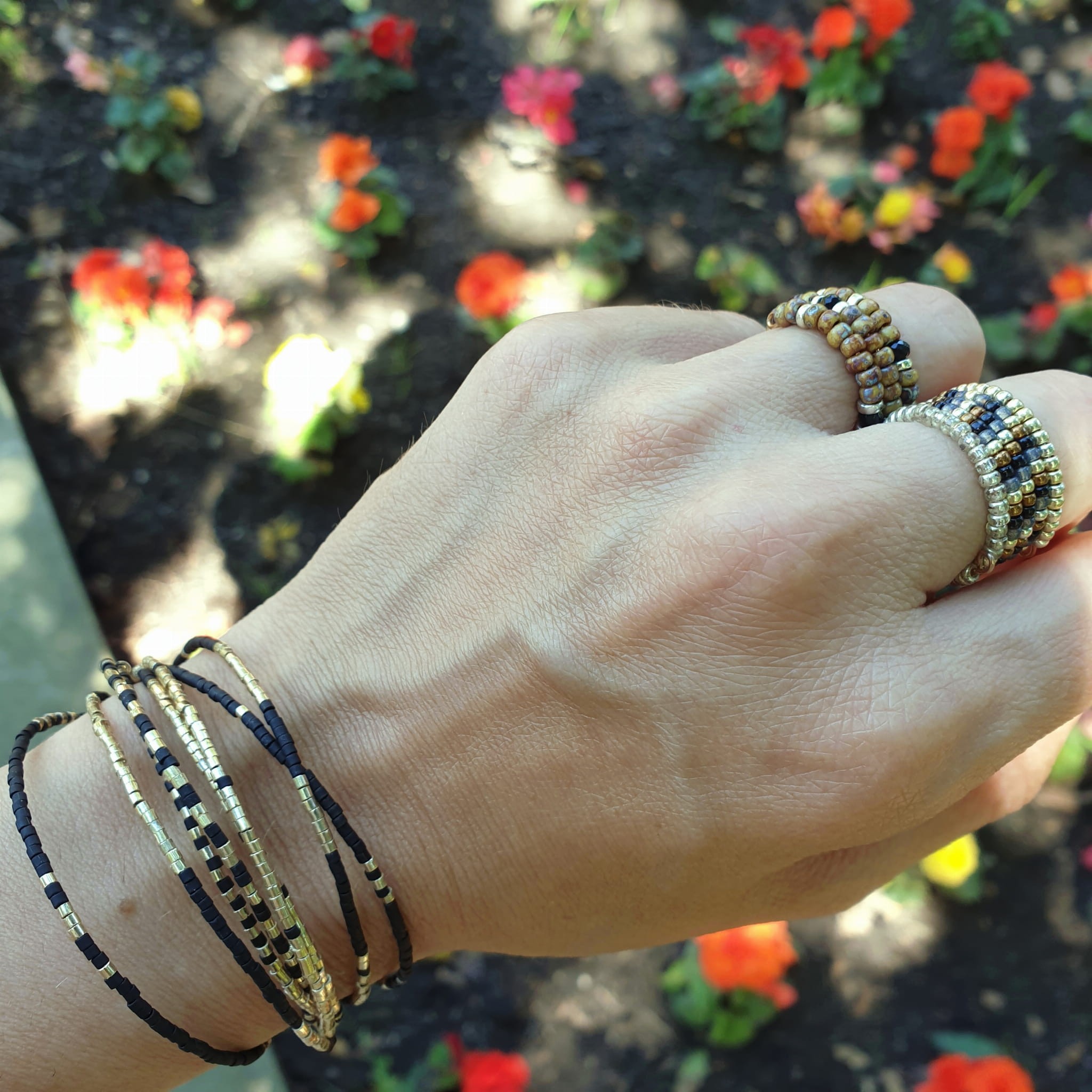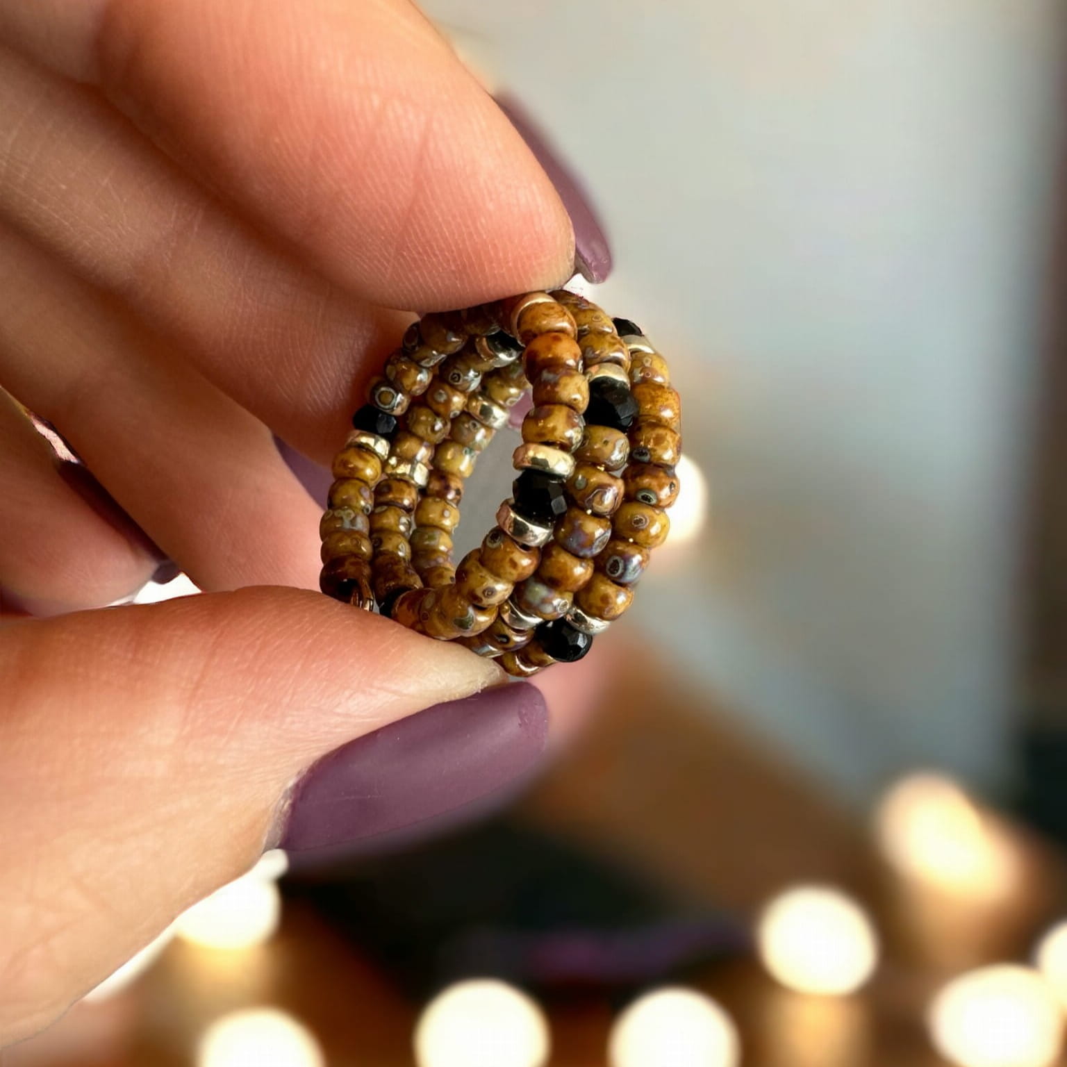 Głównym elementem tego pierścionka są przepiękne koraliki o różnych odcieniach brązów oraz beżów które tworzą delikatne i subtelne wzory. Koraliki są starannie dobrane, tak aby stworzyć harmonijną kompozycję kolorystyczną, która przyciąga uwagę i dodaje uroku.