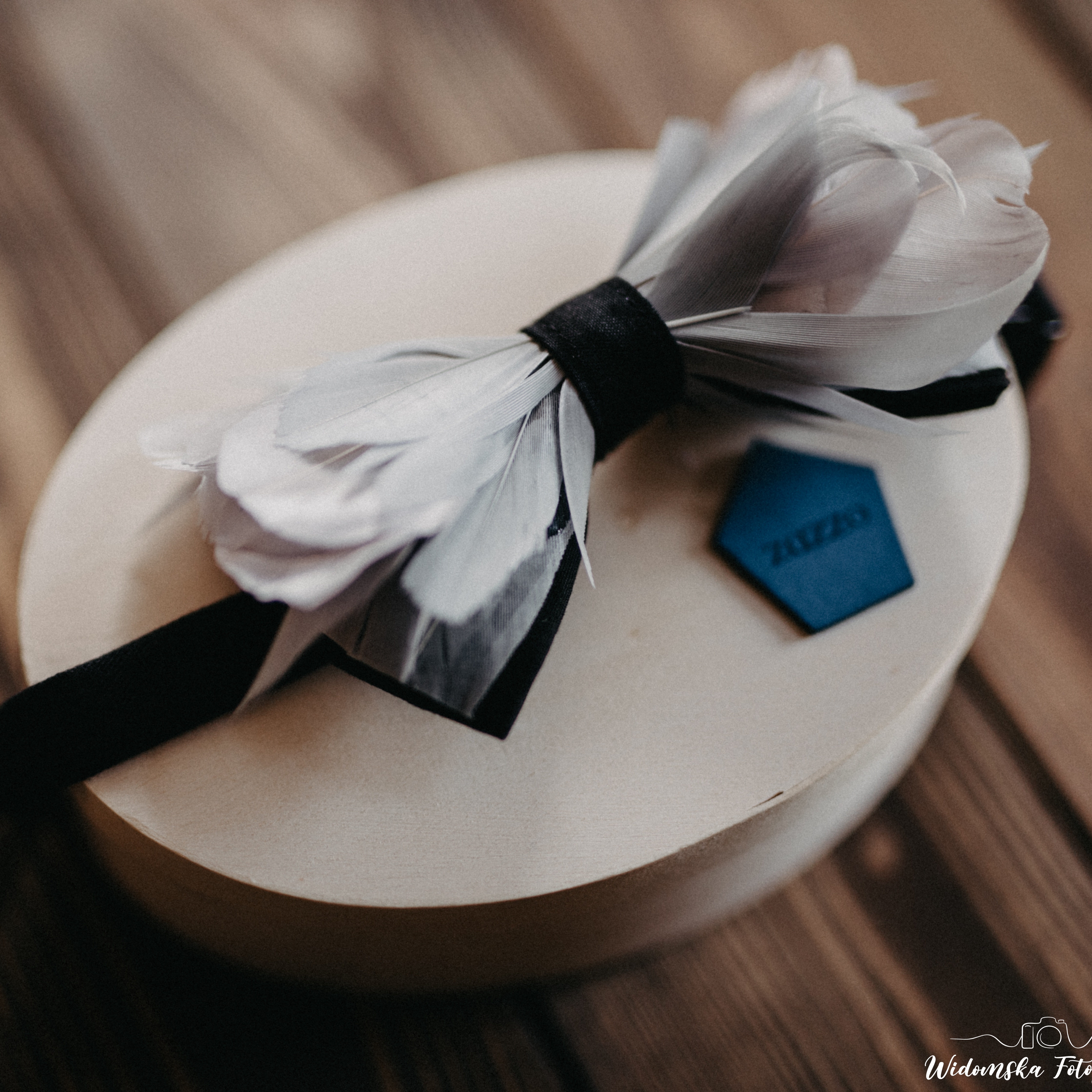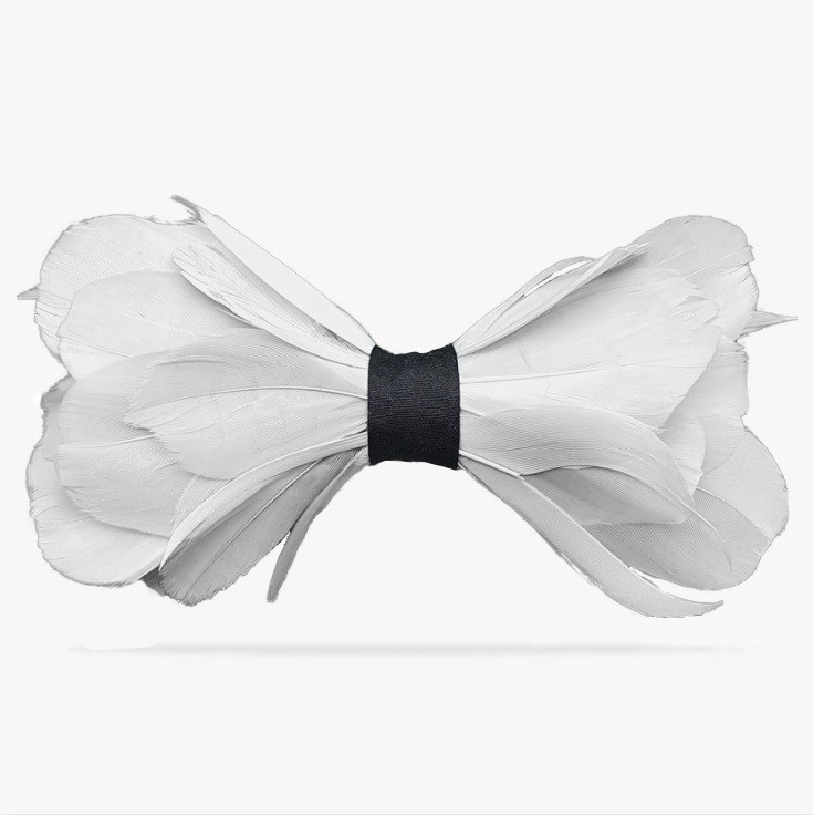 Dbanie o produkt | Muszka męska Swan jest dostarczana w eleganckim pudełku. Znajdziesz w nim informację jak o nią dbać oraz listę użytych piór.