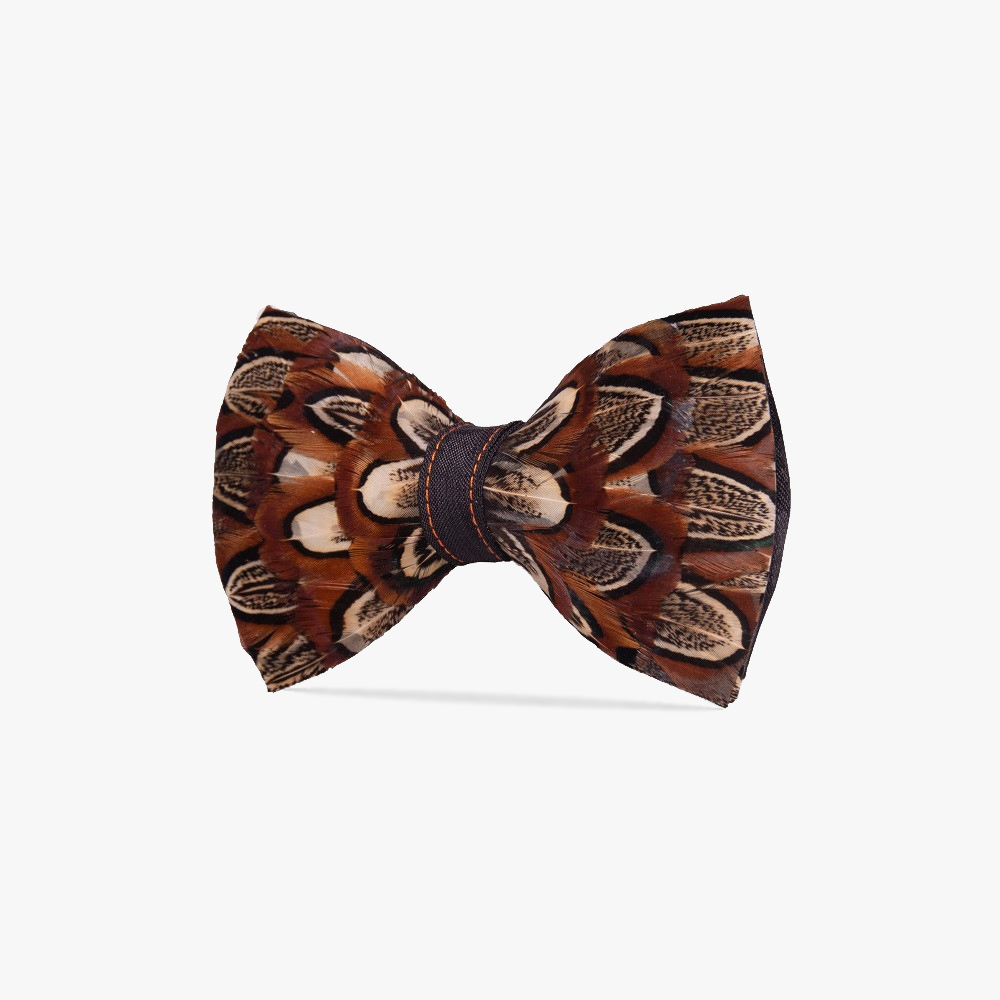 Szczegóły produktu | Barwy muszki zachodzą od brązu po biel. Wzór w środku pióra są jej wyróżnikiem. Muszka łączona jest delikatnym przeszyciem w kolorze pomarańczowym podkreślającym jej kolor.